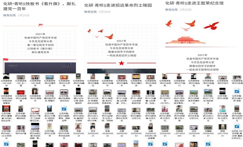 寒假期间,化学院研究生各党团支部组织开展了“红色推荐官”视频征集活动,征集了关于家乡红色文化、革命记忆及乡村建设、振兴相关的推荐视频共164份。经过筛选,利用学院官方微信及抖音平台对部分优秀作品进行推送,带动各支部成员进行党史学习。此外,积极鼓励学生参加各类献礼建党一百周年系列视频活动,在全体范围内形成了良好的党史学习氛围,对党史学习产生了积极的影响。