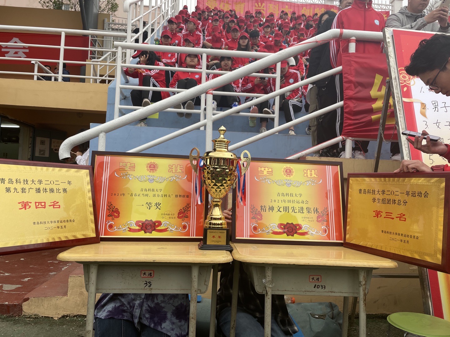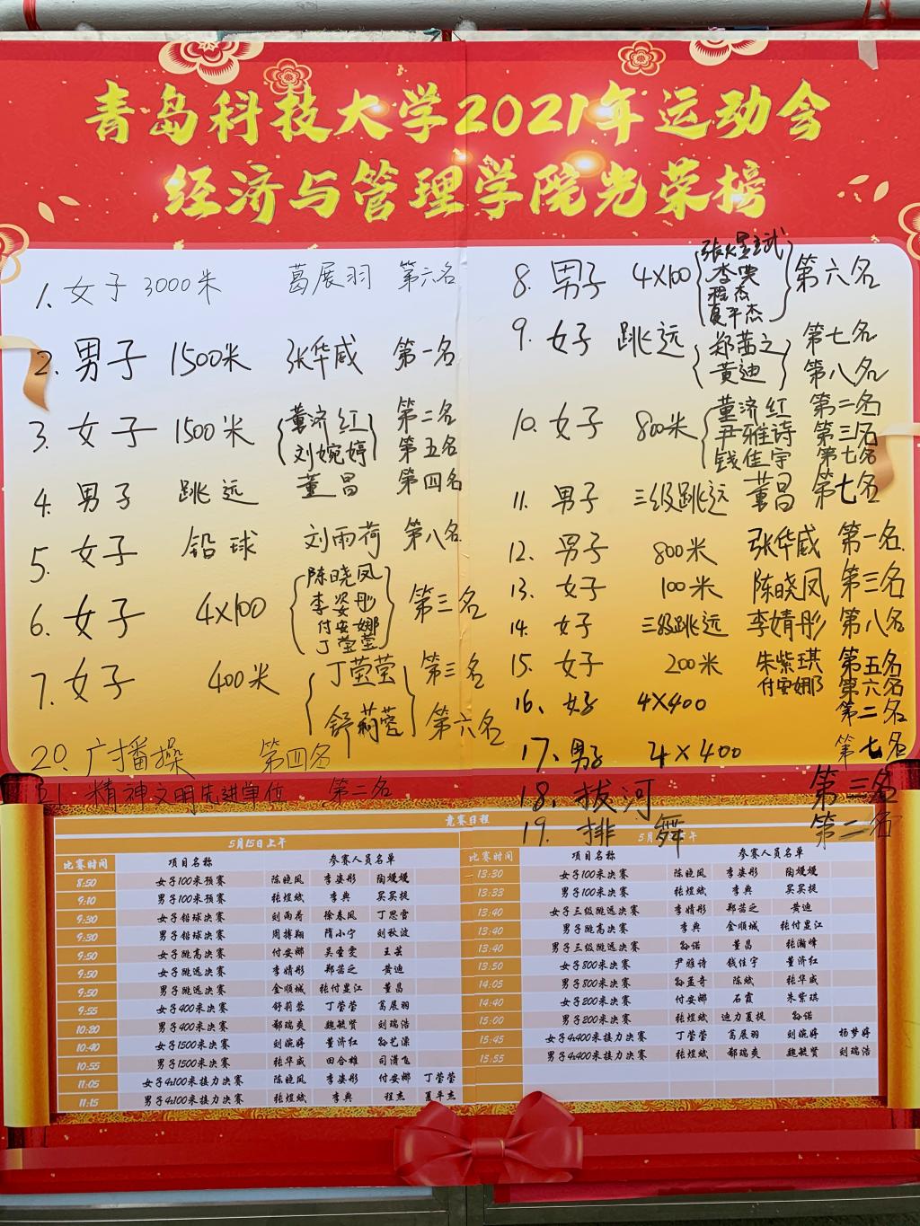 收获——经管学子再创佳绩。在运动会现场,经管学子顽强拼搏,斗志昂扬,以团队凝聚力与超强战斗力,最终获学生组团体总分第三名、精神文明先进集体荣誉;田径队取得了崂山校区第一名,四校区第三名的优异成绩,其中张华威夺得男子800米、1500米决赛第一名;董济红获女子1500米第一名、女子800米第二名;女子4*100米接力赛夺得第三名等;排舞联赛获崂山校区第一名、四校区第二名、一等奖的好成绩;广播操比赛获崂山校区第二名、四校区第四名;拔河比赛获得四校区季军。