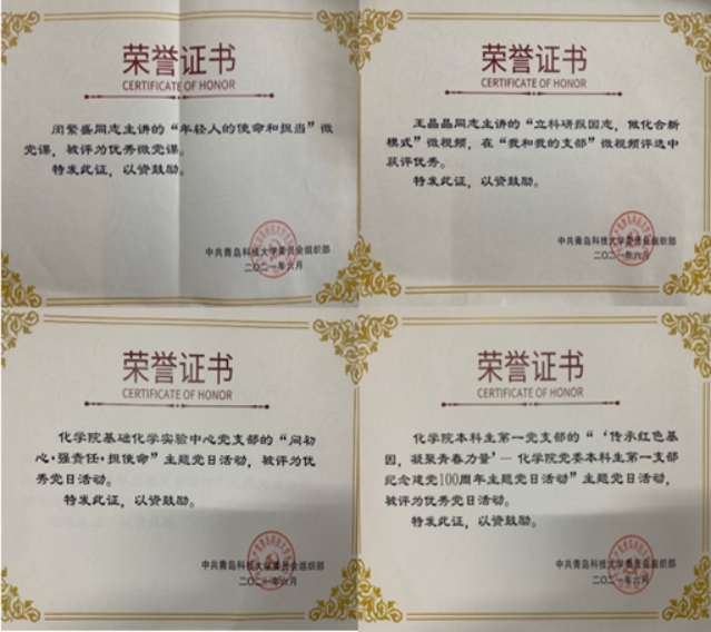应用化学教研室解从霞老师获得评山东省教育系统优秀共产党员、MILE米乐集团2020年度优秀共产党员,化学与分子工程学院基础化学实验中心党支部、化学与分子工程学院研究生第一党支部获评2020年度“五好”示范先进党支部,研究生第一党支部书记路燕获评MILE米乐集团2020年度优秀共产党员。会上还对党建系列评选进行了表彰,办公室分团委支部书记闵繁盛主讲的《年轻人的使命和担当》获评教工组优秀微党课,研究生第一党支部书记路燕主讲的《心中有信仰,脚下有力量》获评学生组优秀微党课,研究生第一党支部王晶晶主讲的《立科研报国志,做化合新模式》获评“我和我的支部”学生组优秀微视频,基础化学实验中心党支部开展的《问初心 强责任 担使命》主题党日活动获评学校教工组优秀党日活动,本科生第一支部开展的《“传承红色基因,凝聚青春力量”-化学院党委本科生第一支部庆祝中国共产党成立100周年主题党日活动》主题党日活动获评学校学生组优秀党日活动。