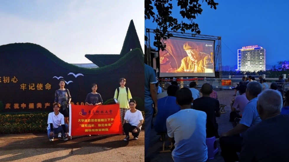 7月30日,实践团成员首先到达嵩县建党百年雕塑旁共同学习、交流和宣传建党百年以来中国共产党不忘初心、砥砺前行的成长历史和伟大成就,之后合影留念。从建立中华人民共和国到开启改革开放和社会主义现代化建设新时期,再到进入中国特色社会主义新时代,中华民族迎来了从站起来、富起来到强起来的伟大飞跃,迎来了实现中华民族伟大复兴的光明前景!傍晚,实践团成员在嵩县湖滨公园中同民众一同观看红色电视剧《跨过鸭绿江》,学习、感受、体悟伟大抗美援朝精神,交流所思所想。回望抗美援朝战争的伟大历史,我们时刻牢记不畏强暴、反抗强权的民族风骨,万众一心、戮力前行的民族力量,舍生忘死、不惧牺牲的民族血性,从历史中汲取攻坚克难的坚定决心,雄赳赳、气昂昂地奋勇向前。