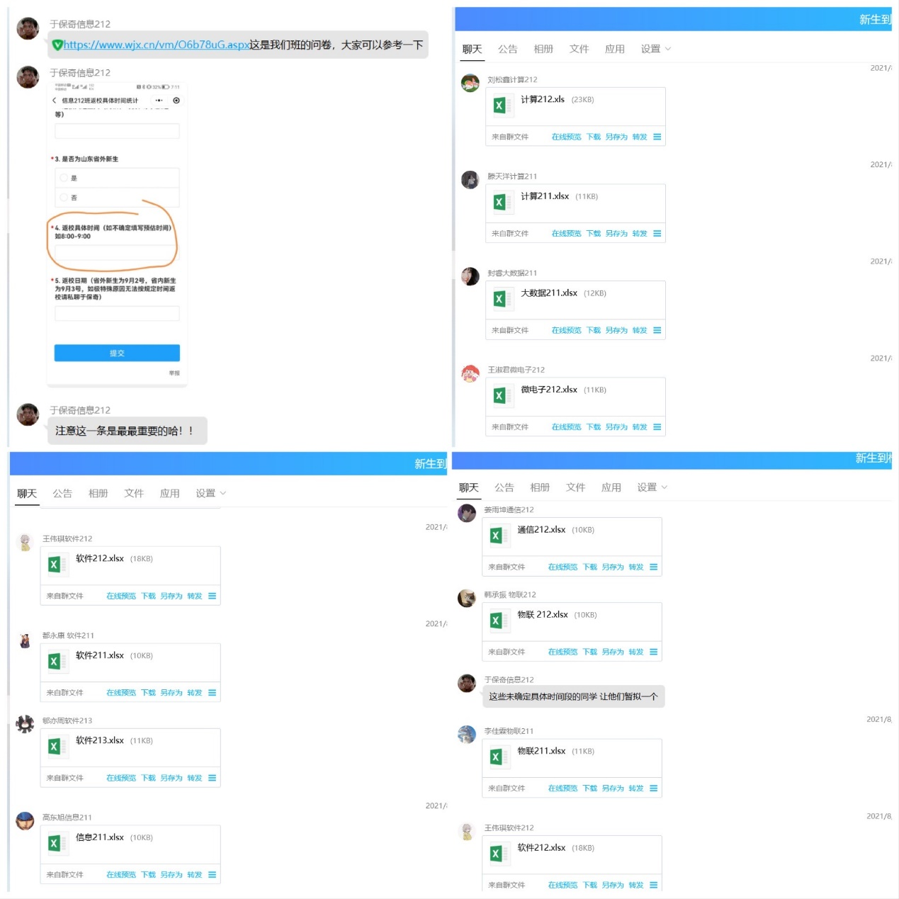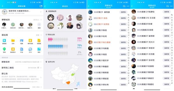 为能及时向2021级新生传达学校学院通知,帮助新生答疑解惑,便于日后更好地适应大学生活、尽快适应新环境,信息学院、大数据学院建立官方2021级新生群、班级群。与此同时,为确认每位新生的入群情况以及个人信息的完备情况,学院依托学生会、领航学长积极主动地与新生取得联系并确认信息。成员之间分工合作、团结一致,99.55%新生已入群,为后期各项工作的开展提供保障。