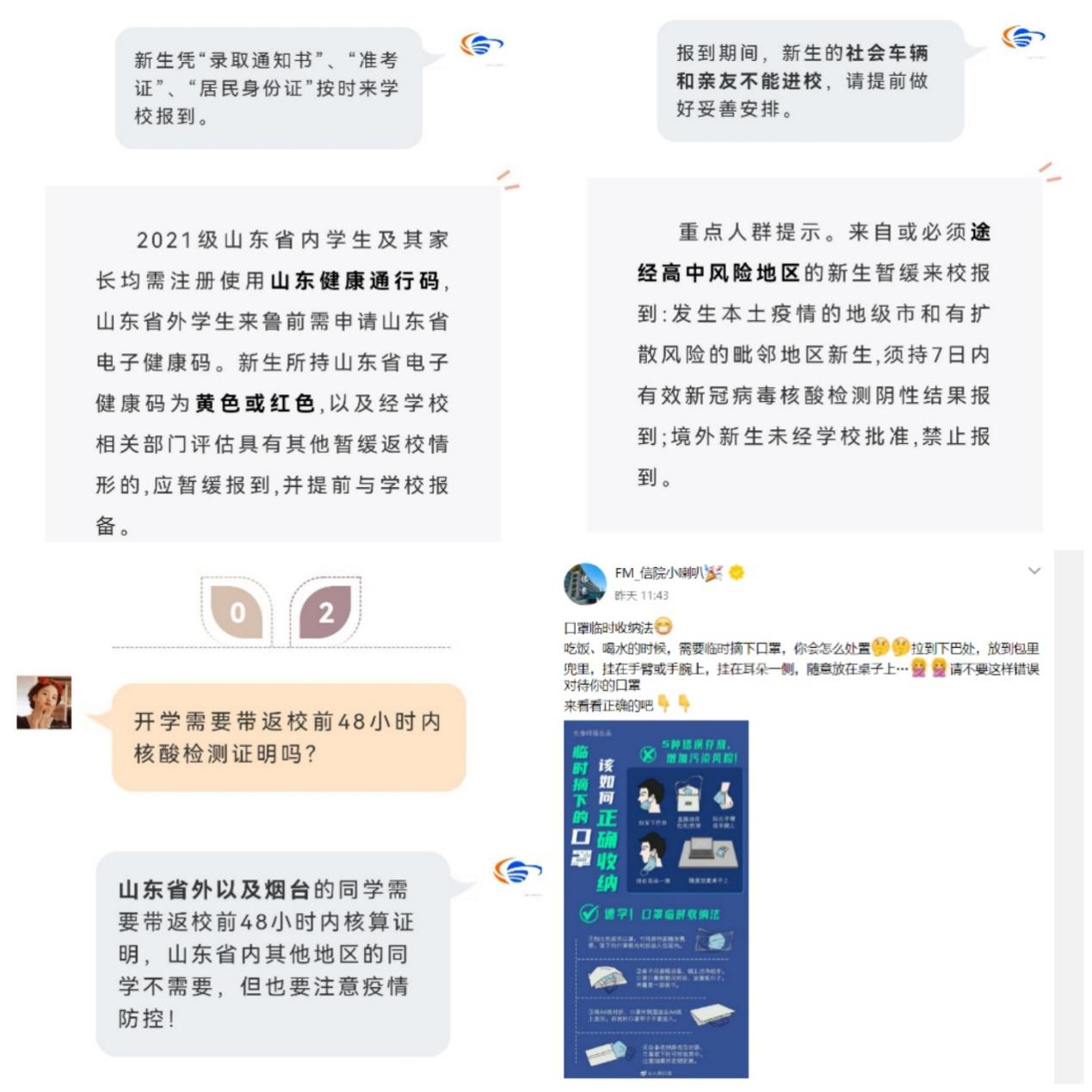 面对当前疫情形势,为提高学生的自我保护意识,学院在严格做好疫情防控的同时,全力做好防疫宣传工作。学院利用官方微信公众号、QQ公众号积极推送防疫知识、自我保护手段,提高同学们的防疫警惕性。此外,由于不同地区学生返校要求有所不同,为确保同学们能够顺利返校,学院将返校要求以推文形式发布于微信公众号,使同学们清晰了解学校疫情防控要求以及入学前所需要做的准备。