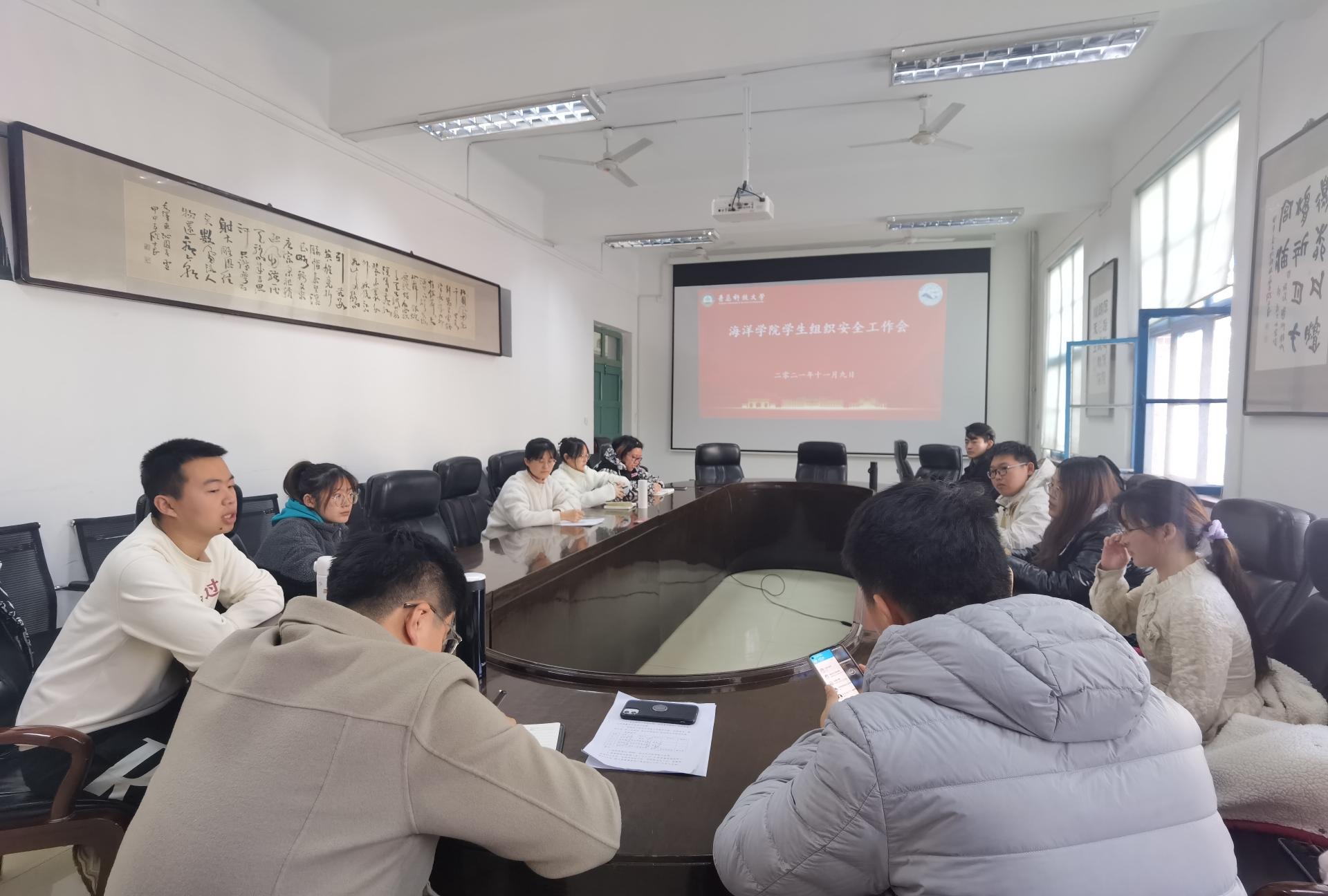 11月9日,海洋学院学生组织安全工作会在海洋学院会议室召开。海洋学院学工办主任兼团委书记、学生会指导老师李浩,第四届学生会主席团成员及各部部长参加本次会议。会议由李浩主持。