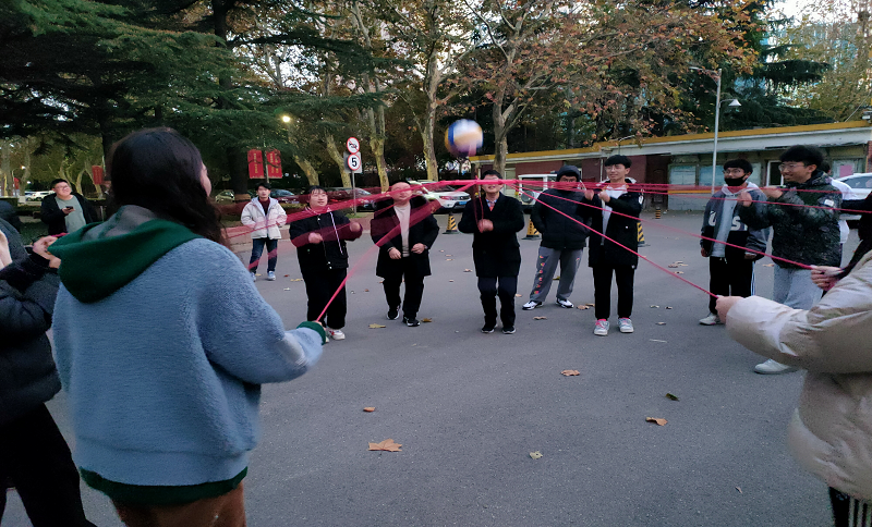 携手同心,奋力一击。应化中美211团支部随后开展“携手同心,奋力一击”趣味游戏。全体成员分为两组开展,每组10人,每人手持两根绳子,10人同时发力使球弹起而不掉落记一分,分高者胜。本项游戏在娱乐的同时锻炼全体成员的身体协调能力与团队协作能力,只有所有力量汇集成一点才能使球准确弹起,只有全体成员齐心协力方能成功。