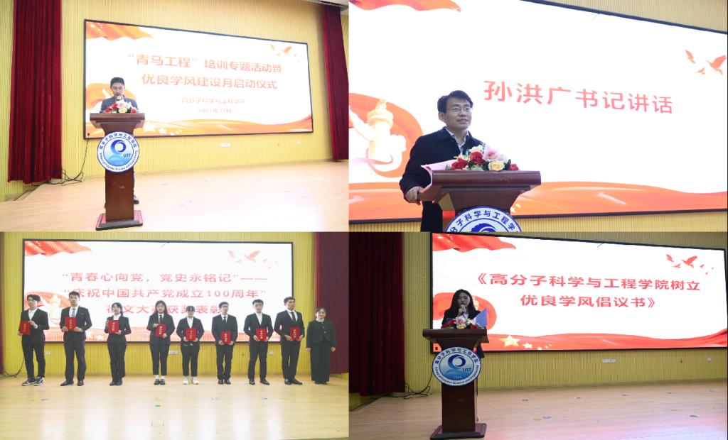 仪式上,尤亭亭为《青春心向党,党史永铭记”“庆祝中国共产党成立100周年征文大赛》获奖的同学颁奖。院学生会执行主席崔雪纯宣读了《高分子科学与工程学院优良学风创建倡议书》,引领同学们锤炼过硬本领,树立优良学风。