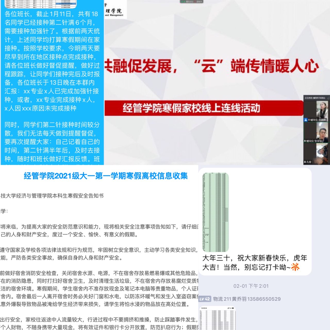 为了让全体学生度过一个平安、健康、祥和的春节假期,经管学院严格贯彻落实学校学院疫情防控的决策部署,主动谋划、系统联动,积极转变常规假期模式,切实以“四化四到位”确保假期期间立德树人“不断线”,教育管理“不打烊”,全力做好假期学生教育管理服务及春季学期开学准备工作。