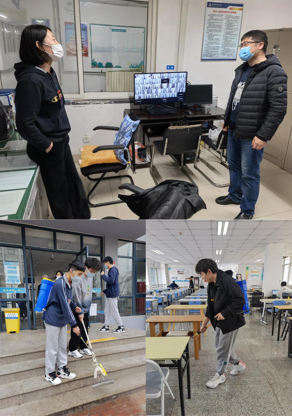 生活保障暖心,守护学子安心。校园封闭管理初期,不少学生表现出对生活物资、看病就诊等问题的担忧,各年级辅导员第一时间深入学生宿舍,明确防疫政策及保障措施,特殊学生一对一谈心谈话,及时发放相应防疫物资,打消学生的焦虑顾虑;对于疫情防控期间学生发热、腹泻等需外出就诊情况,严格按照学校流程,辅导员陪同转诊,时刻关注入住隔离宿舍后的生活、身体健康情况;现阶段宿舍成为学生学习、生活的主要阵地,学院落实落细“我为青年办实事”,规范化管理宿舍内学习吧,制定《学习吧座位管理规定》、《学习吧值班条例》,组织学生会、星火义工队定期整理宿舍“学习吧”桌椅、私人物品,为更多学生提供学习场所,保证学习吧公共资源的使用效率,保持文明整洁的学习环境,进一步提升学生学习质量;严把宿舍消杀关,开展宿舍全面清洁消杀工作。学院领导及全体辅导员带头上阵,组织学生例行大扫除,全方位清洁消杀北七宿舍楼,消除安全隐患,营造干净、整洁、和谐的宿舍环境。