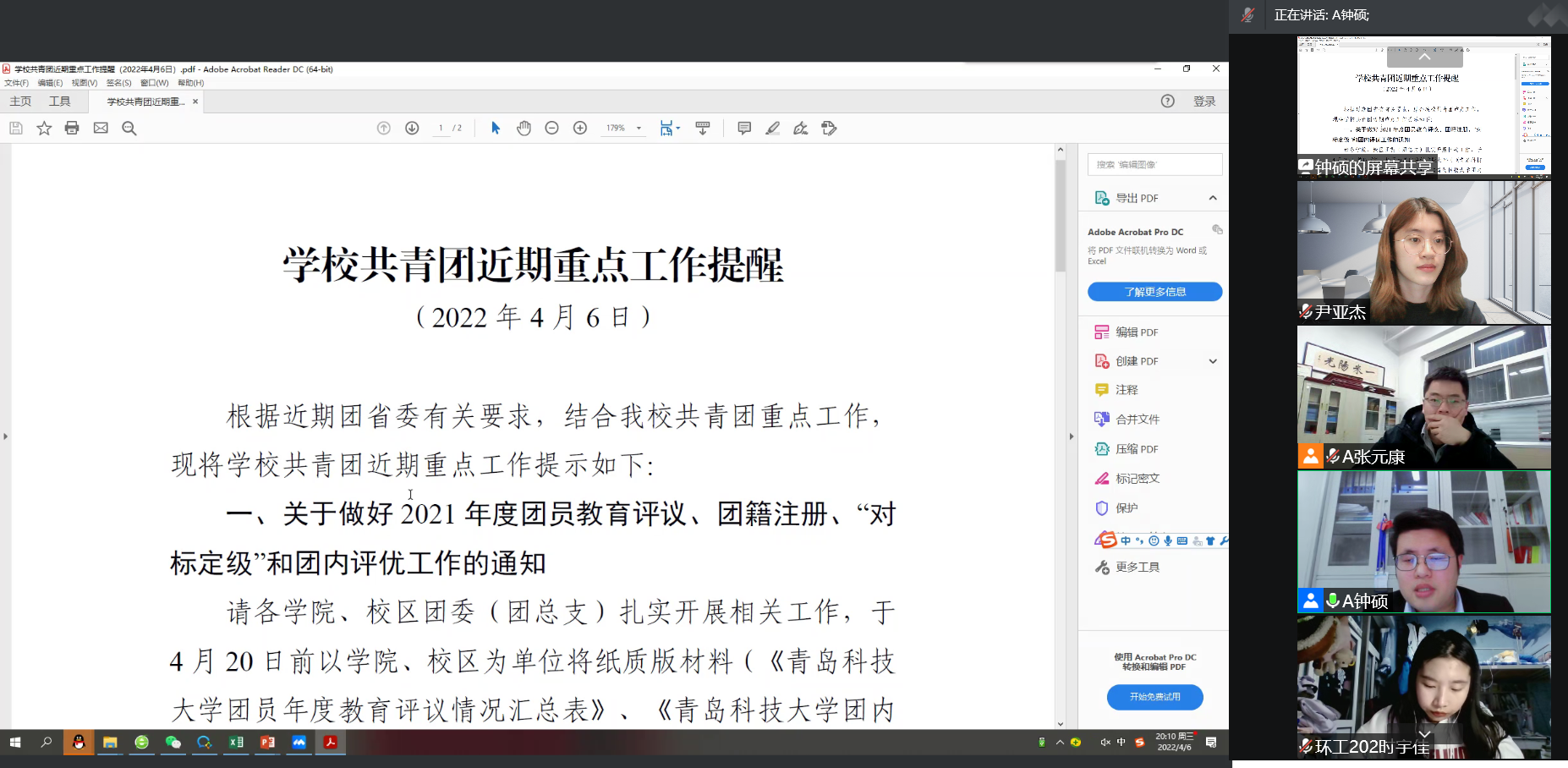 为进一步规范团的基层组织建设,落实上级团组织工作要求,以优异成绩迎接党的二十大和建团一百周年,4月6日晚,环境学院召开共青团工作线上部署会,学院团委全体专兼职团干部老师、本科生及研究生全体团支书参加本次会议。会议由学院学工办主任兼团委书记钟硕主持。