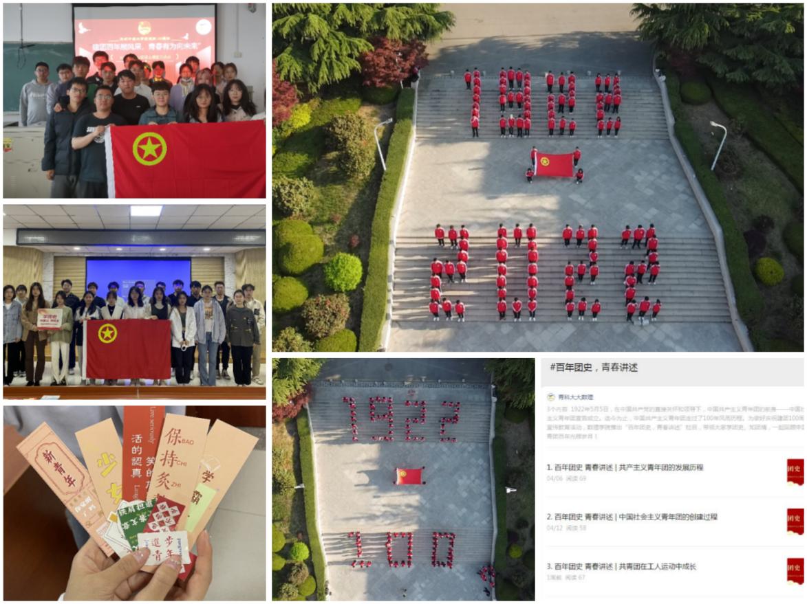 百年华诞,恰是风华正茂;青春献礼,正当奋进前行。数理学院团委各团支部通过“强化仪式感召、强化文化熏陶、强化氛围营造”,集中开展快闪、“我与团旗合个影”、重温入团仪式、面向团旗宣誓、发表入团感言等活动,组织全体共青团员实地接受一次“沉浸式”的精神洗礼。开辟“百年团史,青春讲述—建团百年”微信公众号宣传专栏,组织党史团史知识竞赛,掀起线上线下团史学习热潮。