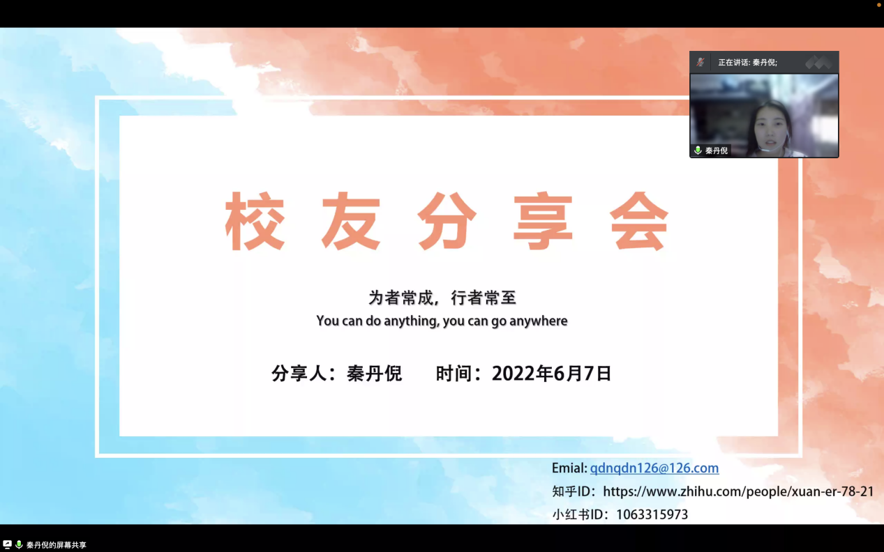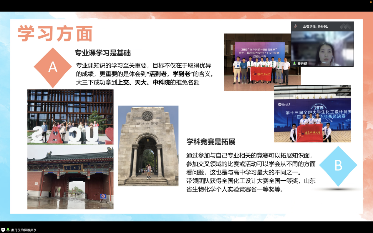 为搭建起校友与在校学生之间沟通的桥梁,促进学生全面发展,6月7日晚,化工学院举办“忆青春·畅未来”校友分享会之“为者常成,行者常至”线上专场讲座。本次分享会由2016级化学工程与工艺专业的校友秦丹倪主讲,化工学院团委副书记耿赛主持,2021级学生及田径队运动员聆听本次专场讲座。