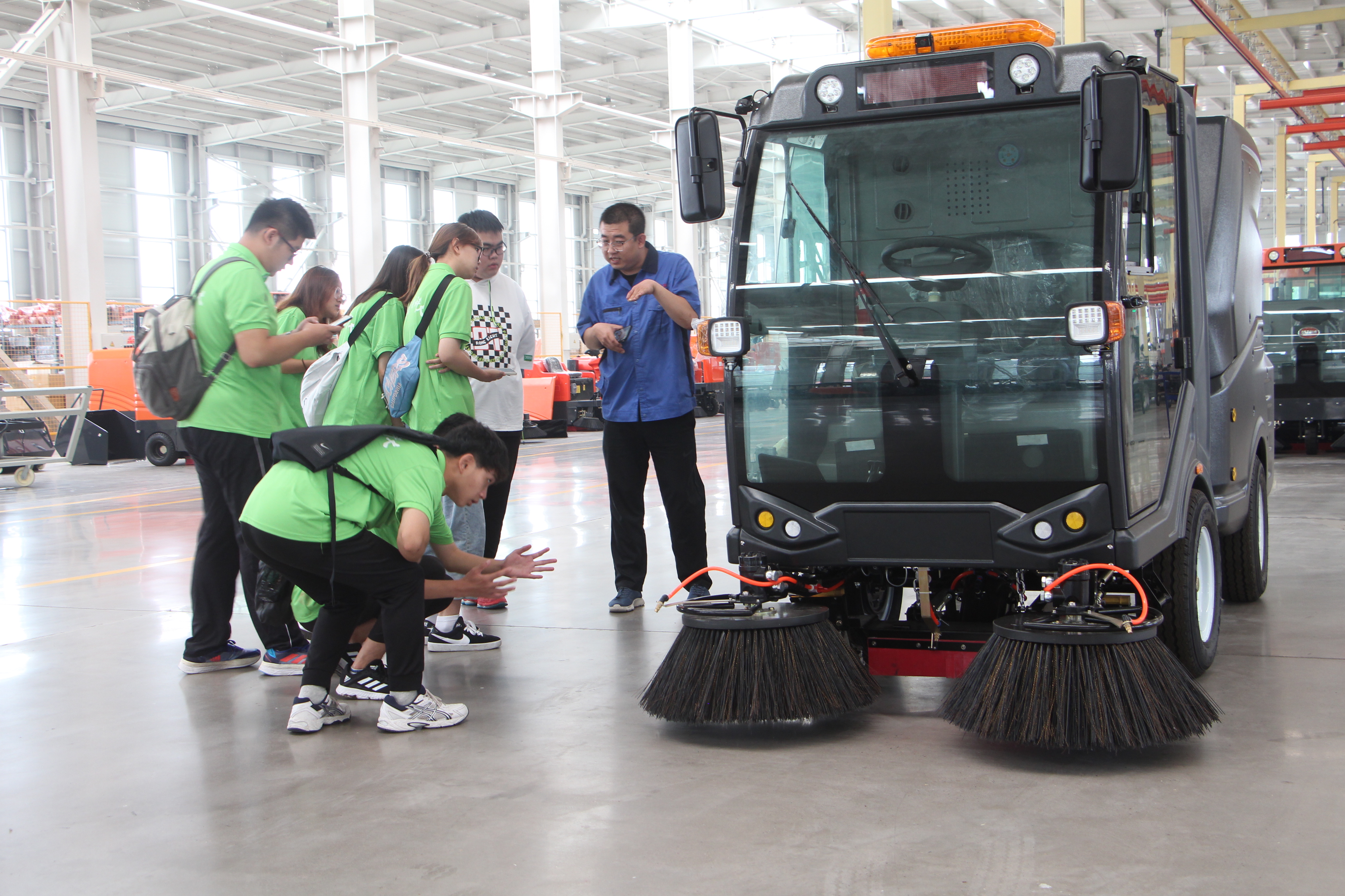 随后,实践团队一行在朱晓峰、孙金友的带领下深入厂区一线进行调研考察,参观了农业机械、工程机械、农机驾驶室等生产研发线及全自动涂装生产线。同时,走进新能源智能环卫车间,近距离、细致了解高端智能环卫车的设计制造、技术服务迭代输出,感受科技时代发展下企业新旧动能转换步伐。在交流中获悉,中远重科有限公司秉持“绿水青山就是金山银山”的绿色发展理念,不断提升产品的核心竞争力,以打造“中国智造”为己任,深化创新产业驱动、加快企业两化融合及国际化战略步伐,力求更多用户爱上“中国智造”。
