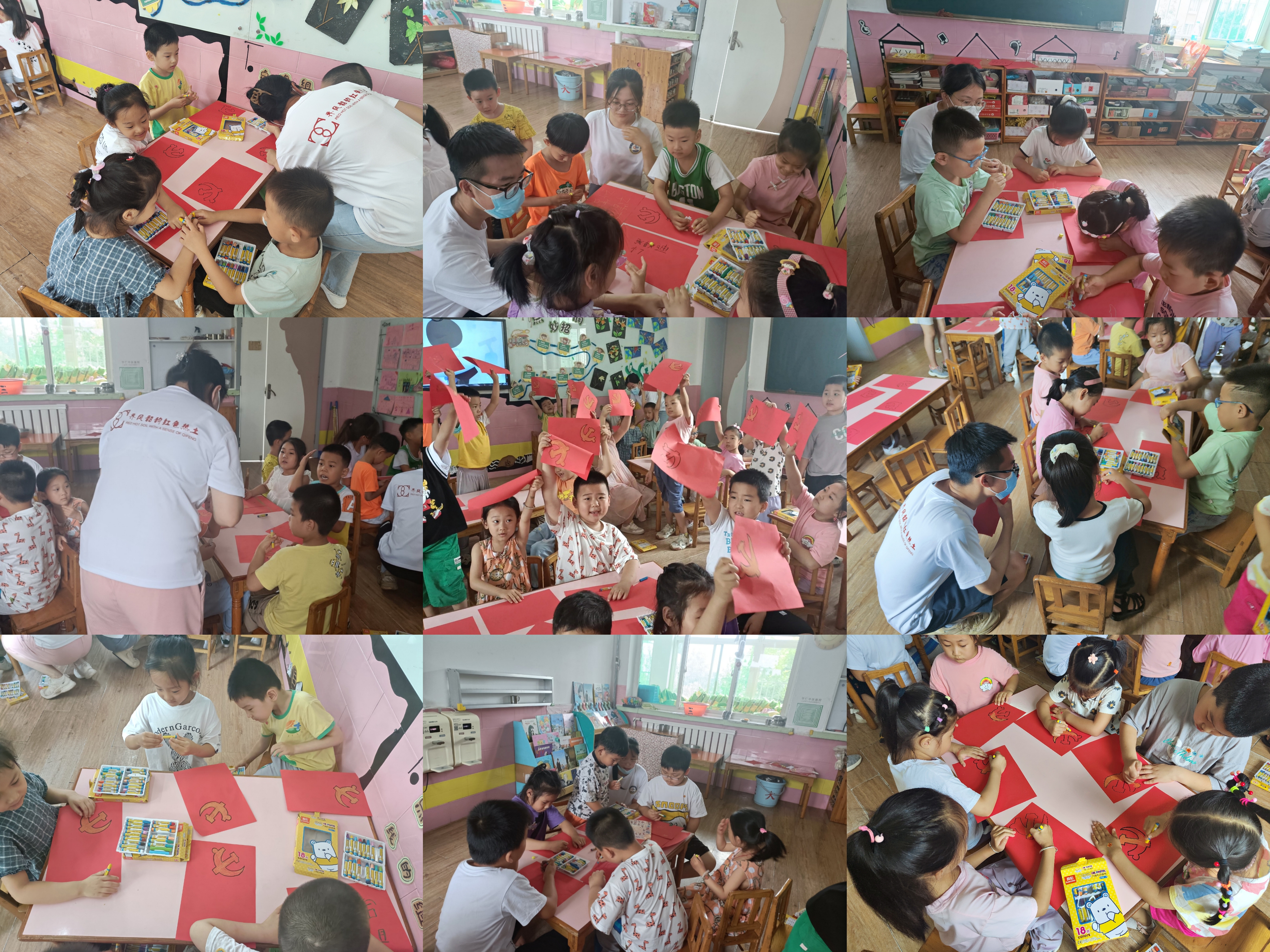 爱国教育的底色是红色,爱国主义教育深深根植于每名中国人的心中。为进一步强化爱党爱国教育,实践队员带领学生们在红色A4纸上绘制党旗党徽和五星红旗由李晓钰讲解党徽的构成以及内涵。通过本次活动,让学生们认识党旗,爱护党旗爱国主义的种子进一步深深根植于孩童的心中。