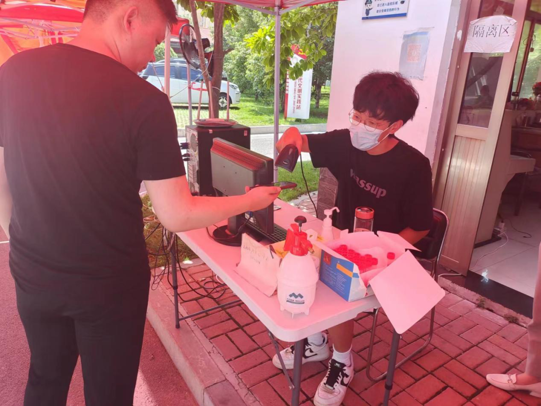 艰难困苦,玉汝于成。‘志’在心中,‘愿’在行动,疫情当前,作为新时代的青年,就应该为社会疫情防控出一份力,为更多的学生起到一个榜样的作用。核酸检测现场,很多老人无法正确使用手机参加检测,志愿者们第一时间主动提供帮助,耐心教导,主动上手教会老人如何使用并带领其顺利完成核酸检测。为了减轻社区工作人员的工作量,为了能让长期坚守岗位的“小蓝”、“小白”得到休息,团队成员们在正午时分主动请缨,给需要核酸的居民们扫码登记,解决他们的部分疑问,让工作人员能有充分时间吃饭休息。