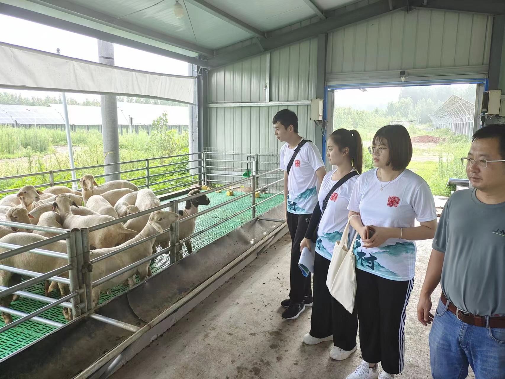在基地负责人的带领下,实践团一行首先来到基地农光互补项目的羊场进行调研。经实地考察和工作人员的介绍,团队成员发现,农光互补工程以发电和农业生产为主,一方面可以提供大量清洁能源、阻挡风沙和暴雨,减少水土流失,利于保护生态环境,同时可促进当地旅游业发展,带动经济快速发展;另一方面,可以提高土地利用率,节约土地资源,为当地养殖户提供丰富的养殖场地,能够促进当地农业发展,带来良好的经济效益。在负责人的指导下,成员们近距离观摩“光伏发电+羊场养殖”农光互补项目的运营,同时结合自身专业知识,就“光伏+农业”发展模式提出了自己的思考疑问和看法见解,在与工作人员的解惑与探讨中,充分认识到光伏发电的必要性和可行性及其在乡村经济、生态发展中所具备的远大前景。