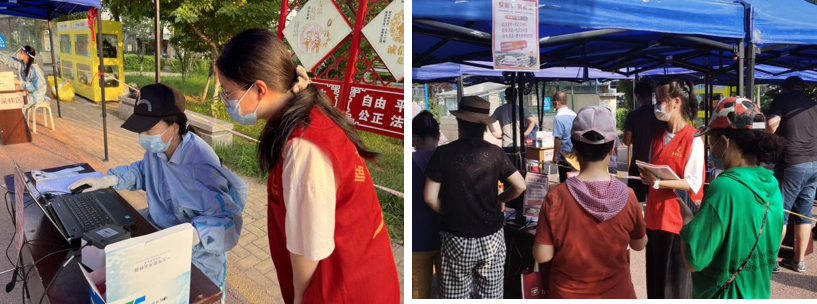 服务伊始,队员们开始有序组织当地居民们进行核酸检测以推进核酸检测的速度。“您好,请提前出示您的码。” “请佩戴好口罩。” “请保持好间距。”队员们的声音在核酸检测的队伍里不断响起。随着时间的流逝,温度不断攀升,但医务人员和志愿者们都始终坚持在自己的岗位。在志愿服务的三个小时里,队员们在辅助核酸检测进行的同时,也深刻体会到了医务人员的艰辛:每一次看似平常的核酸检测背后,是医务人员和志愿者们付出与坚持。