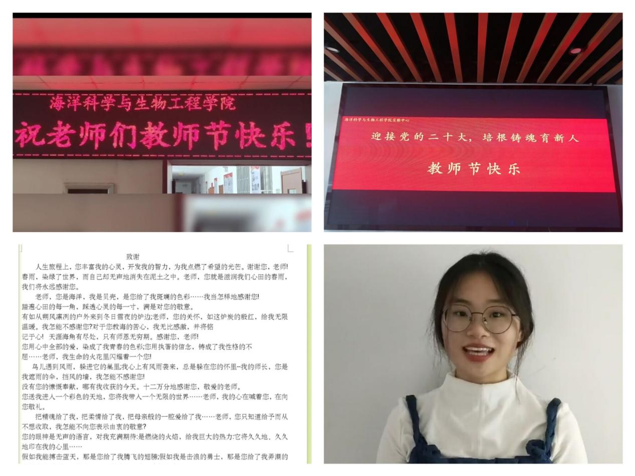 传递祝福,致敬师恩。海洋学子借着秋风明月,通过书信和视频多种形式向尊敬的老师们送上最真挚的问候与祝福。“一朝沐杏雨,一生念师恩”“迎接党的二十大,培根铸魂育新人”,学院通过LED字幕等方式为教师“亮灯”,一盏盏闪烁的灯光,一句句温暖的话语,表达了海洋学子对老师们的祝福与感恩。