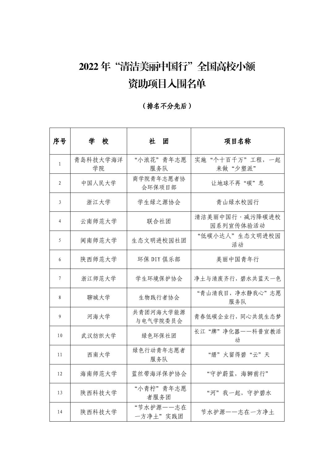 据悉,“2022清洁美丽中国行”微信小程序,共收到来自全国21个省(市、自治区),82所高校的项目方案共计134份。经过专家评审并综合网络投票,共评出入围高校社团方案20份,鼓励高校社团方案26份。