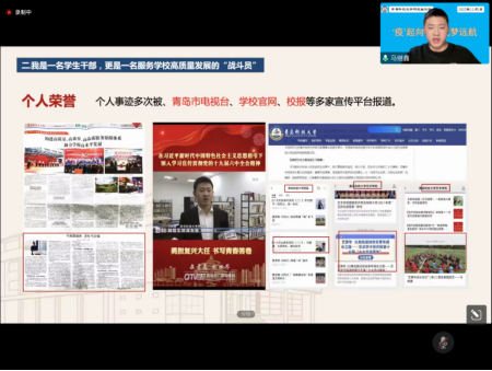 马继鑫同学作题为“以角色驱动夯实青年成长之路”的报告,结合自身经历介绍了关于拔尖选调的相关情况并分享了自己在学术、社会实践、志愿活动等方面的经验以及面对此次疫情的感触。以“角色驱动夯实青年成长之路”为题,呼吁同学们勇敢面对突如其来的疫情,展现青科学子风貌,打赢这一场没有硝烟的战斗。马继鑫是艺术学院美术学专业班长,2019年前往新疆支教一年,发表山东省社会研究成果1篇,学术论文4篇,申报国家专利2项,荣获国家奖学金、团中央“返家乡”社会实践优秀个人、山东省优秀毕业生等荣誉。积极参与学校疫情防控等各类志愿活动,累计志愿服务时长4000余小时。