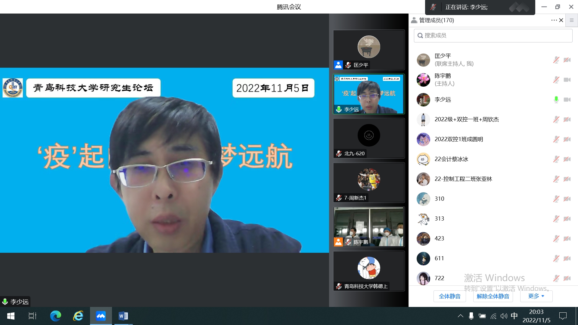 突如其来的疫情,让学校按下了“暂停”键。为丰富全体研究生的学习生活,增强战胜疫情的信心与决心,提高自身学术素养,11月5日晚8点,北苑9号学生宿舍楼战“疫”临时团委举办“‘疫’起向前 筑梦远航”研究生线上学术交流会。本次学术交流会由党委常委、副校长李少远主持,机电学院优秀博士研究生韩德上和校研究生会主席马继鑫作主题报告,崂山校区900余名研究生通过腾讯会议形式参加了本次交流会。