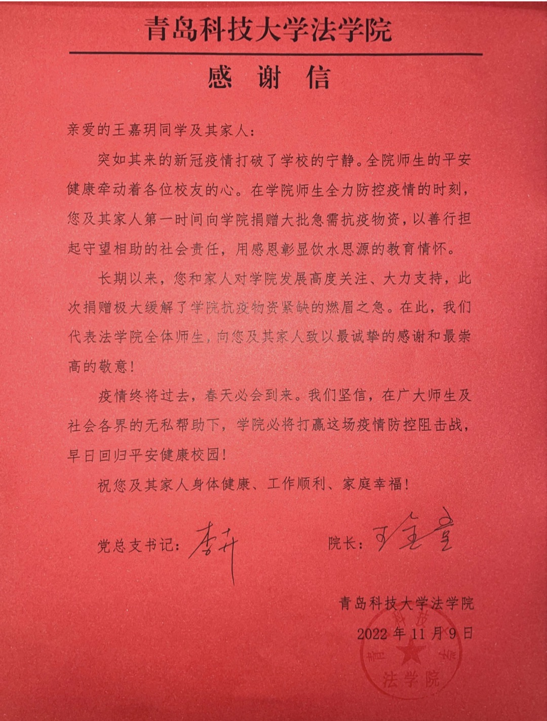 11月3日凌晨,突如其来的疫情给学校崂山校区按下了“暂停键”。面对疫情,法学院师生纷纷以自己的实际行动投身疫情防控工作中,奏响同心战“疫”的主旋律,涌现出许多感人的故事。