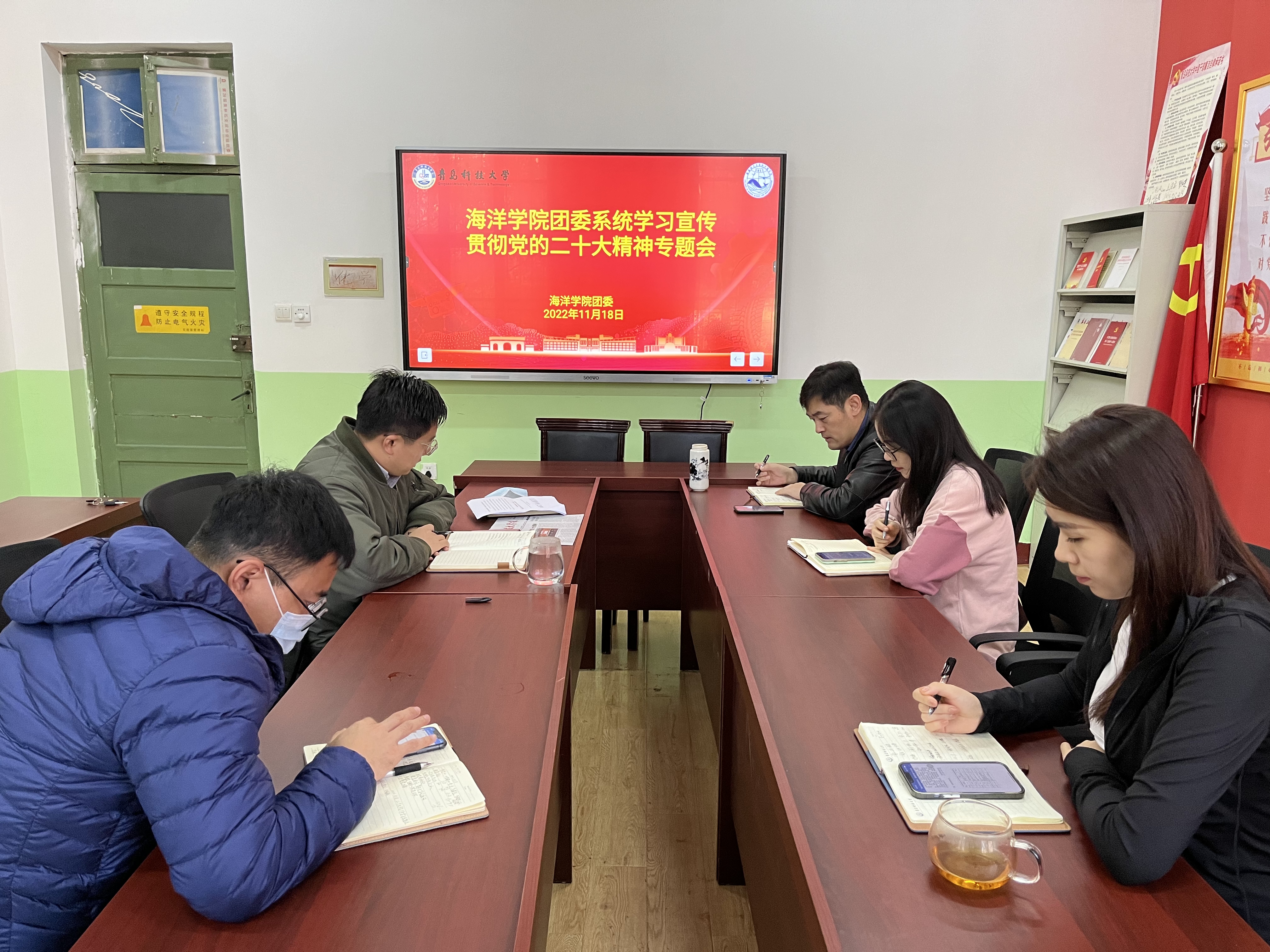 11月18日,海洋学院团委组织开展党的二十大精神宣讲报告会,学院党总支副书记兼副院长臧传永为全体专职团干部宣讲党的二十大精神。