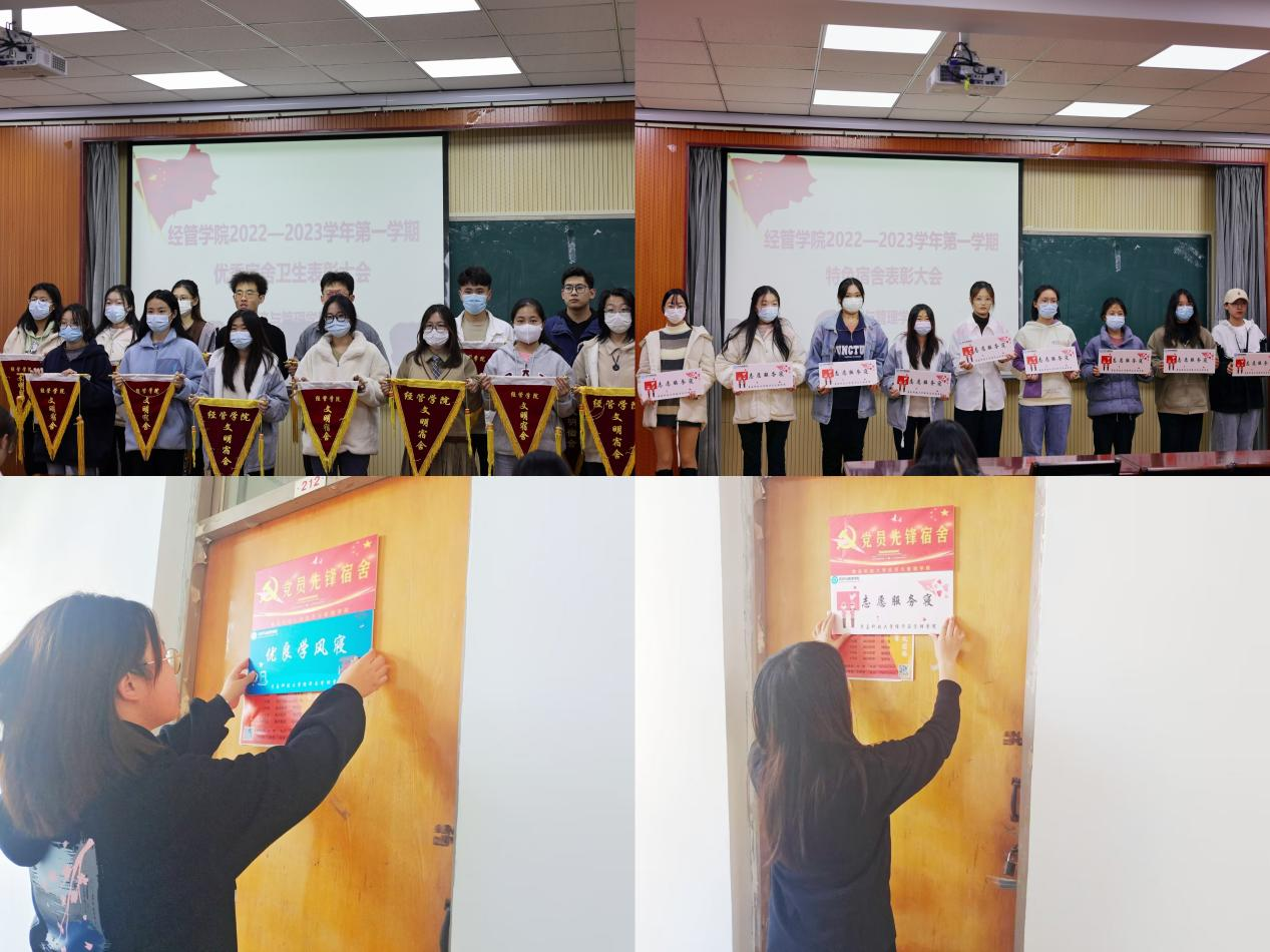 为强化学生宿舍安全和卫生意识教育,督促学生保持安全、良好的宿舍环境,经管学院严格要求各宿舍每周进行卫生大扫除,并积极配合学院卫生检查。同时根据高标准、严要求、抓落实三个要点,评比出经管学院“优秀文明宿舍”,颁发锦旗及奖品,充分发挥模范带头作用,营造温馨和谐的寝室氛围。