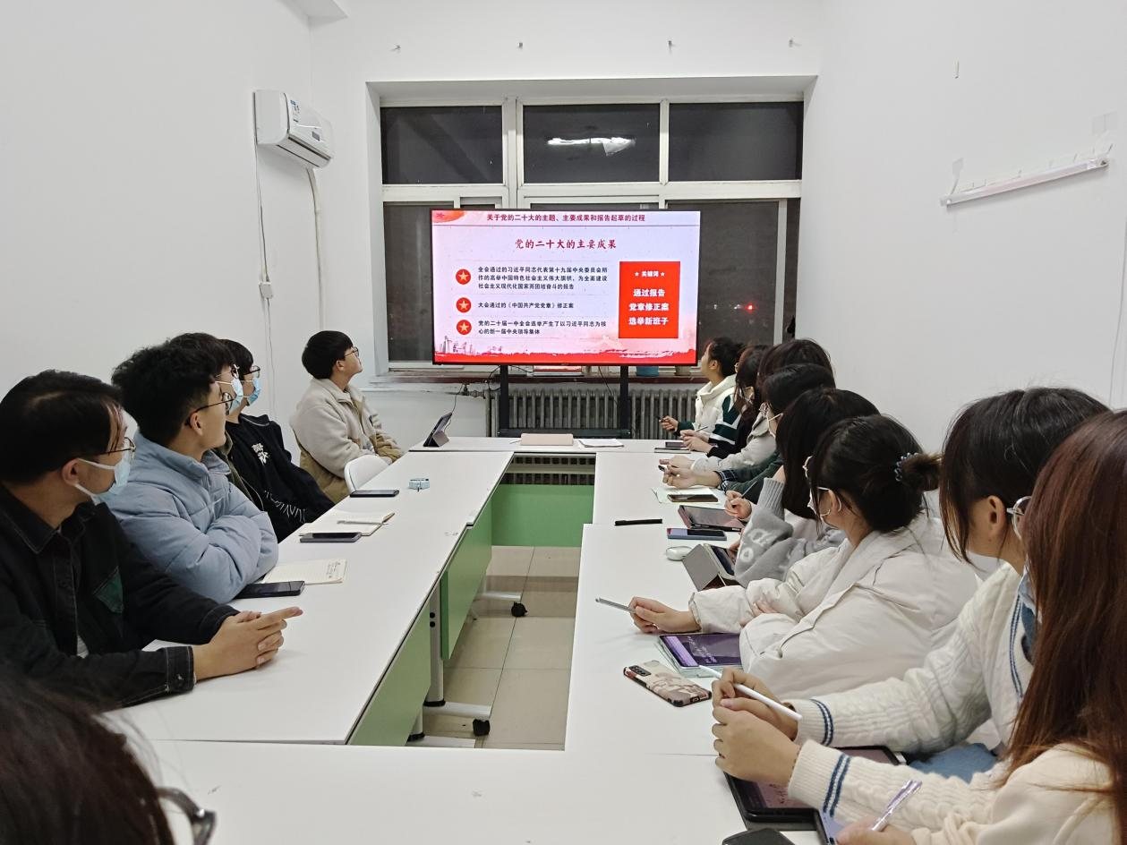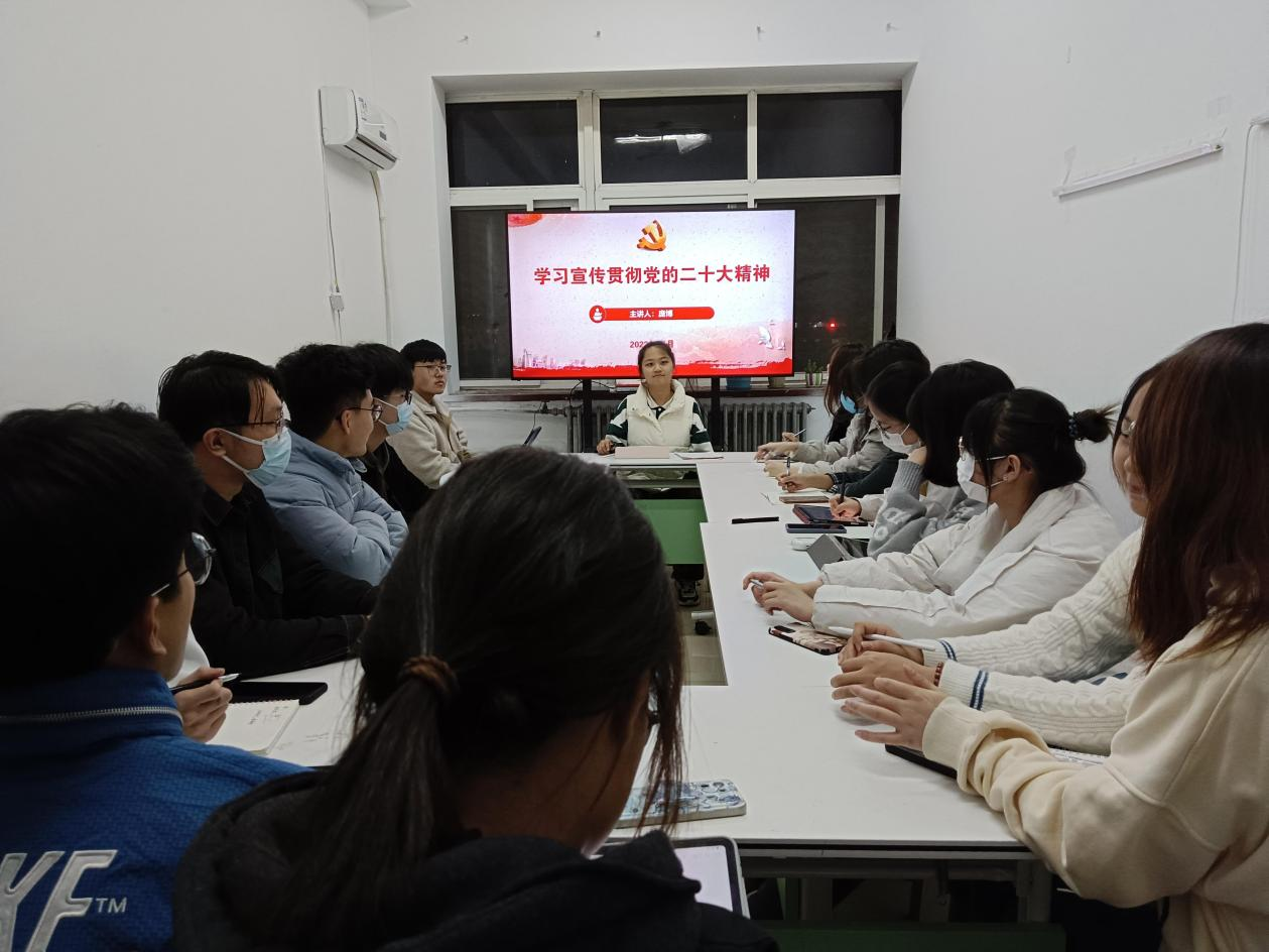 会上,庞博从党的二十大的主题、主要成果和报告起草的过程,马克思主义中国化时代化,中国式现代化,全面建设社会主义现代化国家的目标任务等八个方面对党的二十大精神进行了全面深入的宣讲阐释。她表示,青年作为新时代的希望,要始终保持积极向上的心态。作为学生干部更应该起到一个引领带头的作用,并且要做好学院与学生之间交流的桥梁,及时反馈发现的问题。随后,全体参会成员结合自身学习情况,就“如何从党的二十大报告中汲取奋进力量”展开讨论。参会成员纷纷表示,通过本次党的二十大精神的学习,要更加坚定不移听党话、跟党走,担当起时代赋予的使命。