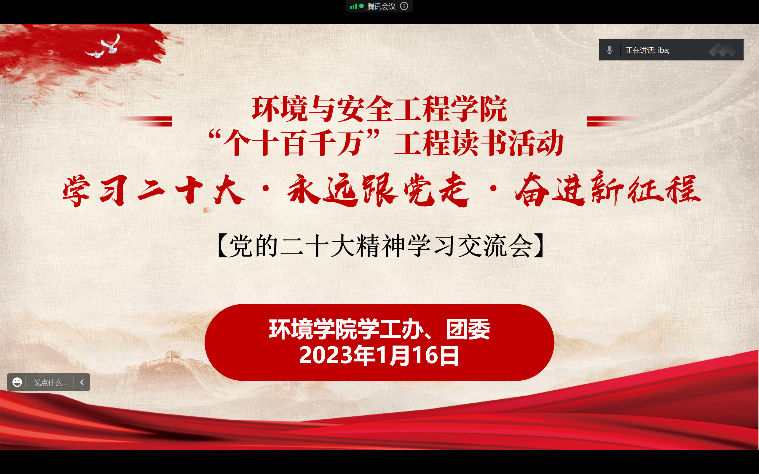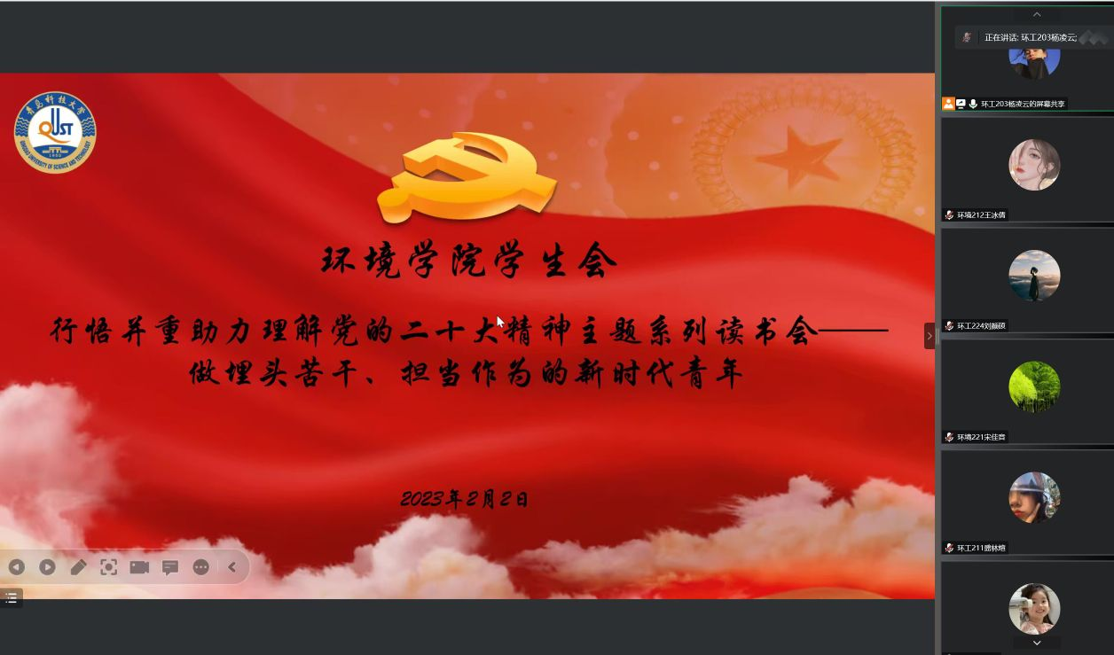 为深入学习宣传贯彻党的二十大精神,进一步激励广大团员青年坚定永远跟党走的信念、增强奋进新征程的信心,形成爱读书、读好书、善读书的浓厚氛围,环境学院于2023年寒假期间举办了“青春昂扬 奋发图强”主题线上读书分享会系列活动。