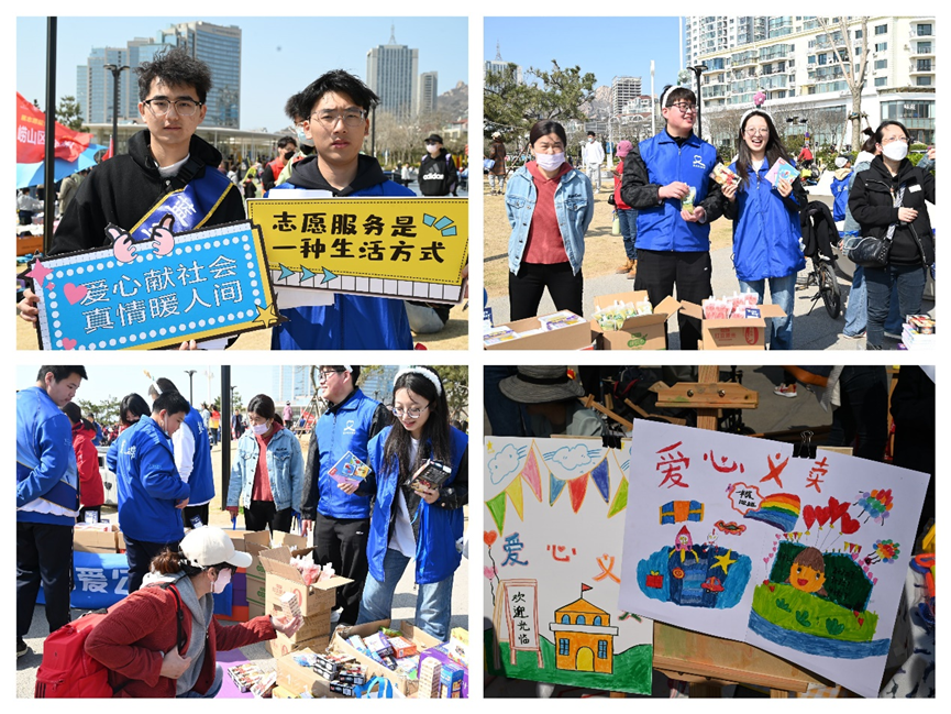 活动中,志愿者们分成两批,一批志愿者负责现场爱心义卖活动,前期在学院内征集义卖物品,收集的物品有书籍,文具,小饰品等等。志愿者在自己负责的摊位前施展才干,热情地向来往的行人推销摊位上的物品。积沙成塔,滴水汇海,本次爱心义卖所得的款项将全部捐给了崂山区蓝丝带助残公益组织,用来帮助我们身边需要帮助的人。