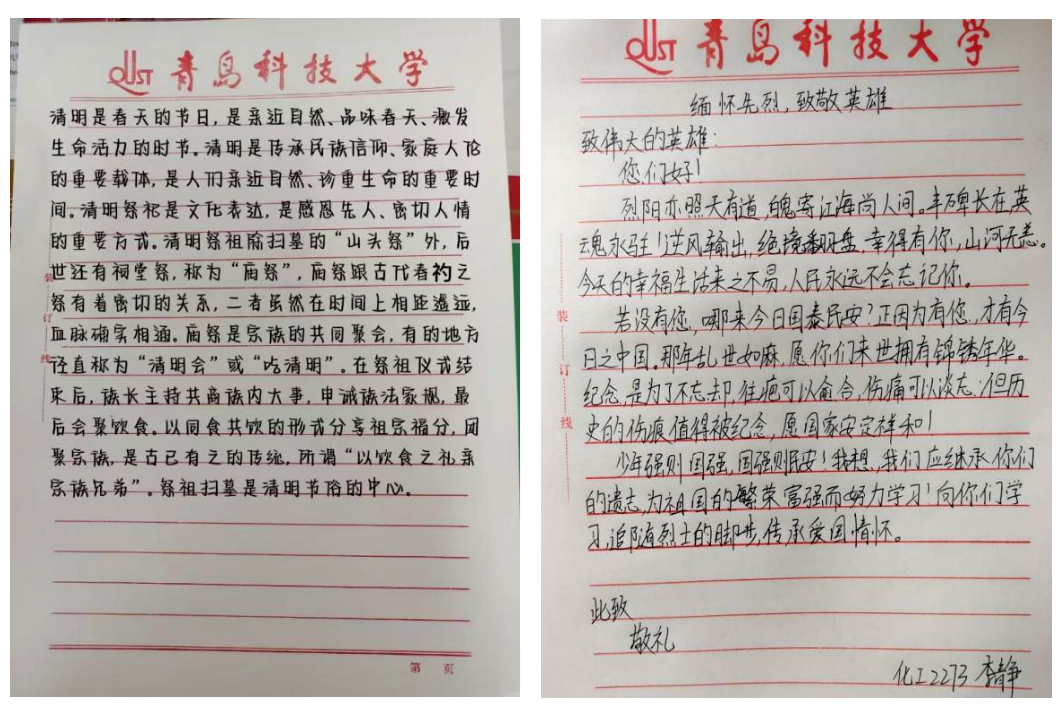 化工专业22级团支部开展“缅怀英勇先烈,弘扬传统文化”征文比赛、“缅怀先烈志,共筑中华魂”知识竞赛、“清明抒情纸鸢寄愿”活动,引导学生树立正确的世界观、人生观、价值观。