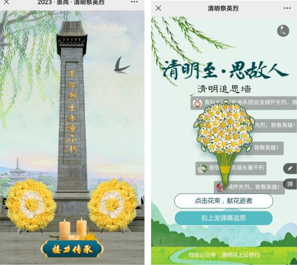 机电专业22级团支部开展线上祭英烈活动,广大学生纷纷通过网络向先贤先烈鞠躬献花、签名寄语,表达对英烈的哀思与敬仰。