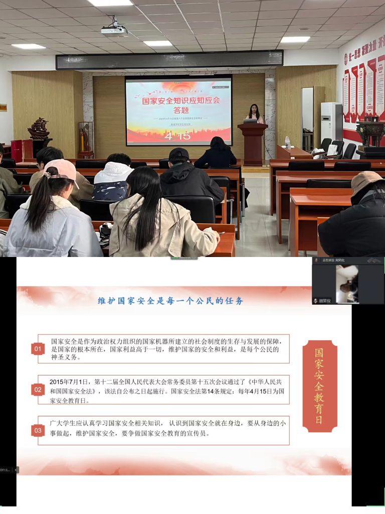 依托“党员网格化”体系,学院学生党员走进结对班级,开展国家安全教育宣讲活动,通过对学院班级“全覆盖式”的宣讲,让学生了解国家安全的概念、公民在维护国家安全中的义务和权利等内容,初步认知涉国家安全法律法规,引导学生了解维护国家安全的重大意义。同期,学生党支部组织国家安全知识知识竞答,现场答题,边考边记,强化对国家安全知识的认知。
