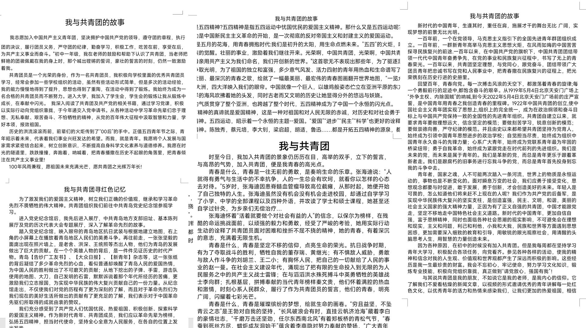 材料学院组织“我与共青团的故事”主题征文活动,学生们结合党史团史学习的深刻体会和对五四精神的深刻认识,写下自己的体会,广大材料青年学生用文字形式回顾共青团岁月的百年光辉历程,书写青年学生勇立时代潮头、不负历史使命的担当。