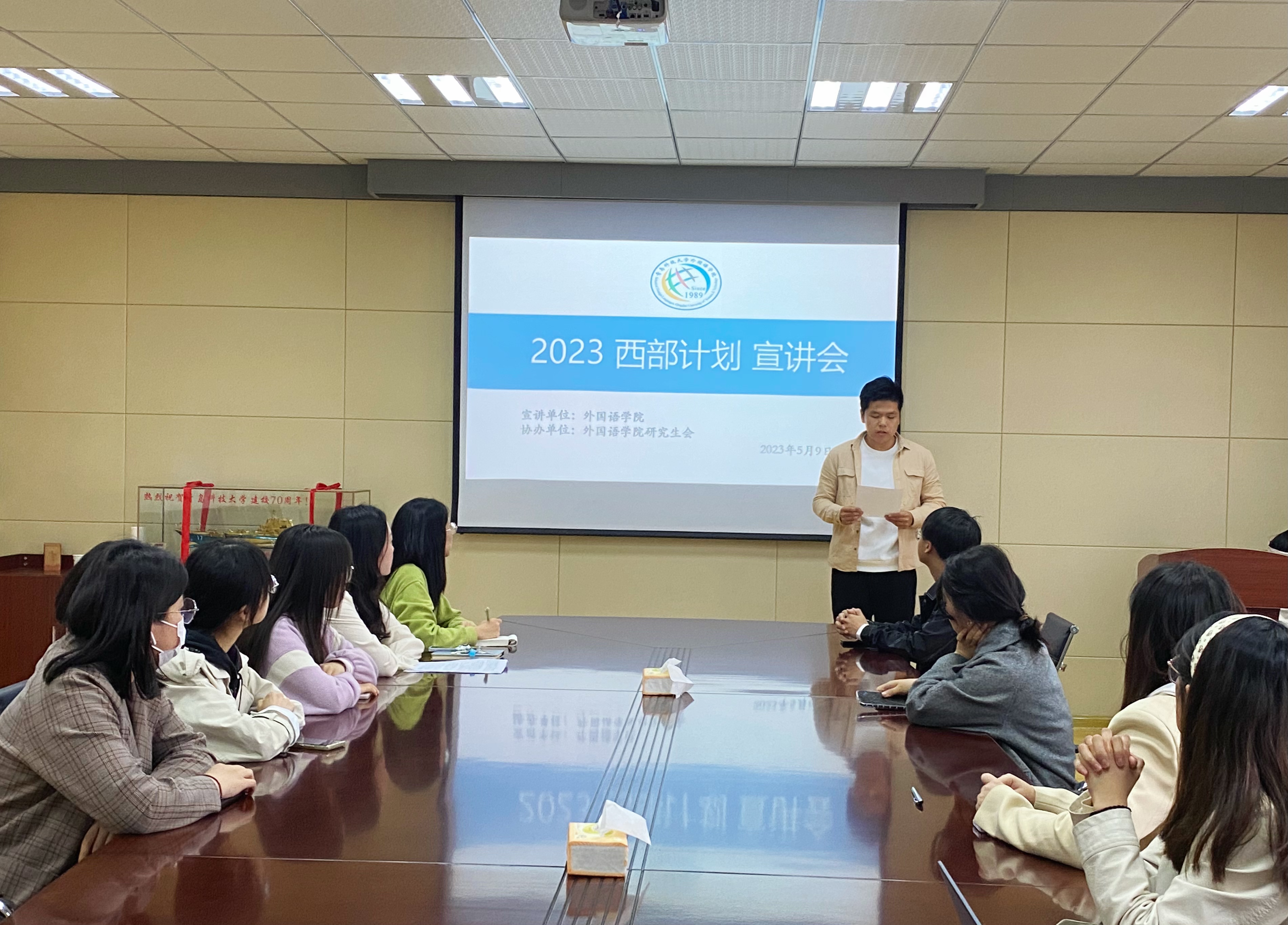 青年当有志,立志为四方。为贯彻落实党的二十大精神,鼓舞全体青年学生感恩回馈社会,增进同学们对国家西部计划的理解,解答大家的疑惑,外国语学院团委于5月9日晚在外国语学院楼517室举办“西部计划”主题宣讲会。本次宣讲会邀请2022届西部计划志愿者巴艳·多合特尔别克、MILE米乐集团第二十三届研究生支教团成员王启真主讲,外国语学院研究生会王潼潼主持,学院部分本科生和研究生参加。