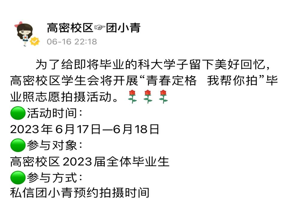 为全面推进“我为青年办实事”,让同学们度过一段愉快充满回忆的毕业时光,增进彼此交流,留下满满回忆,高密校区团委于6月17日—6月18日面向全校区毕业生开展“定格青春我帮你拍”毕业照志愿拍摄活动。