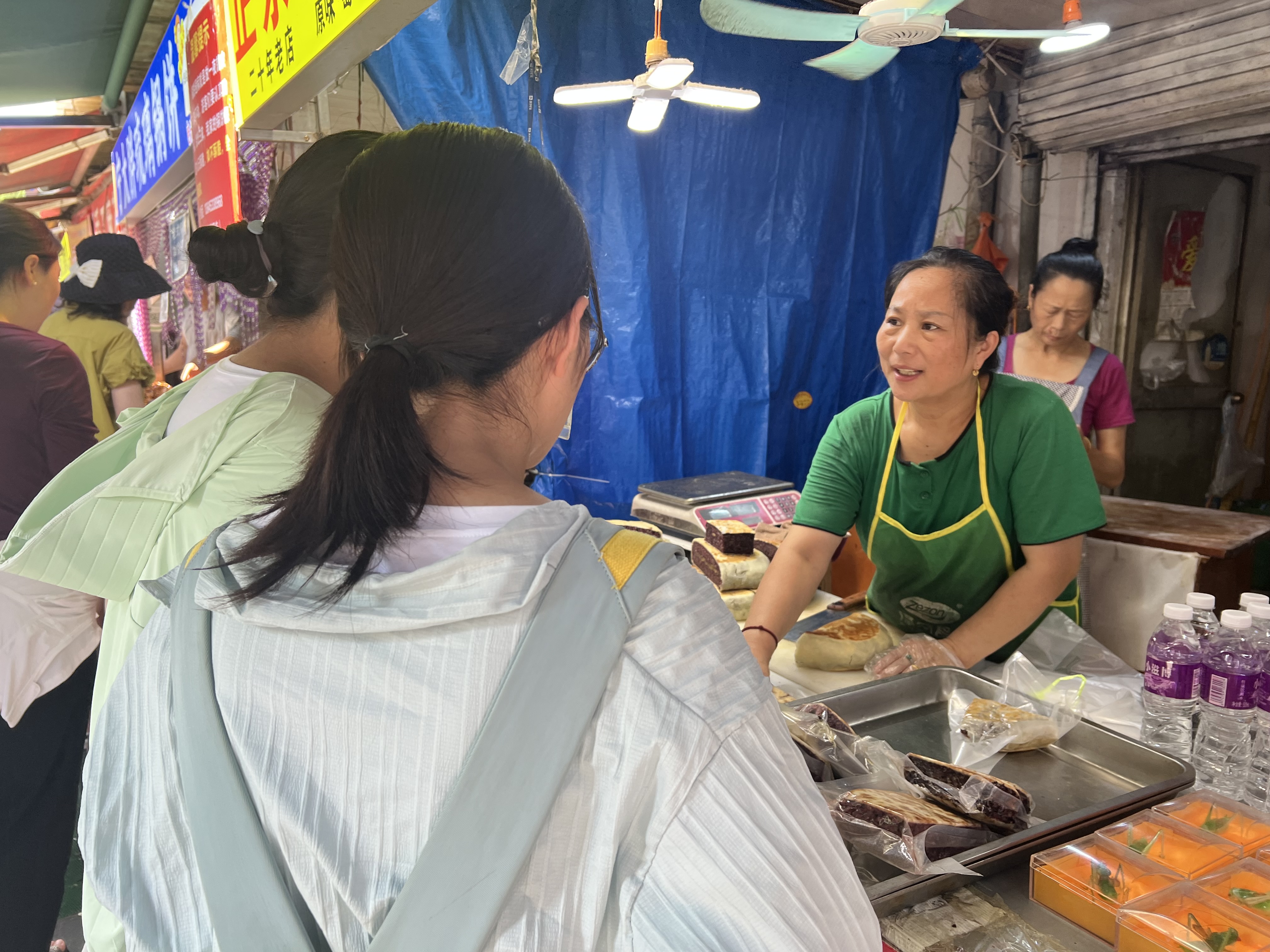 “我们十分欢迎外地游客来到淄博,来到当地游玩,我们也一定尽力让每一位游客玩的开心,来到第二个家——淄博”卖炒锅饼的一位大姐这么说。八大局便民市场中每一个商铺热情揽客,争相让大家尝尝自家新鲜出炉的紫米饼、炒锅饼。络绎不绝的行人手中都或多或少都拿着一份淄博美食。