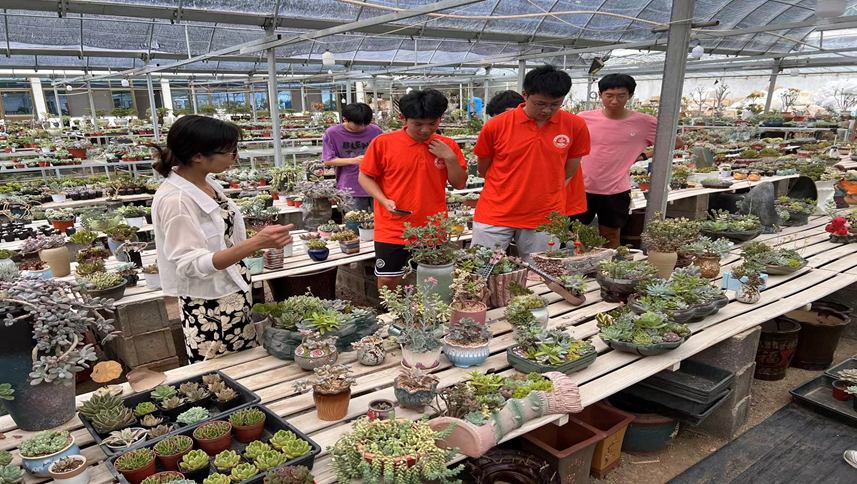 “紫气东来,圆梦乡土情”。随后,为了解当地在“乡村振兴”这个战略下大学生的返乡创业状况,队员们在沂南县多肉花卉种植专业合作社理事长付晓娜的带领下进入了张庄镇娜亩花田多肉植物园。据她介绍,园区的多肉品种可高达2000种。并且,她向队员们详细介绍了多肉的生长过程及生长环境。理事长指出,老家里经营种植苗圃大棚的村民,规模小且收入低,所以她决定带动村民一起致富!付晓娜在大学期间曾荣获山东省巾帼创业大赛三等奖,她用自己所学应用于多肉的栽培和销售,独创了一种“多肉+电商+休闲娱乐”新种植模式,采取“线上直播助农”的销售方式,真正带动了更多的村民走上致富之路。
