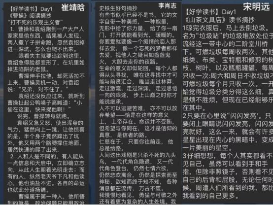 从小川糸的《山茶文具店》到罗贯中的《三国演义》,从史铁生的“生命的意义却似轮回,每个人都得从头寻找,唯有在这寻找中才得以与前贤汇合”到曹操的“对酒当歌,人生几何!譬如朝露,去日苦多。”......本次读书分享会呈现了多元化特征,涉及题材广泛,内容形式多样,既有传统意义上的文学作品,又涵盖了历史、哲学等领域的专著。