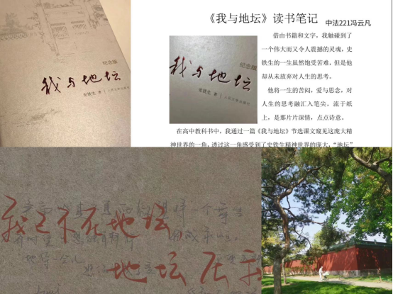 在阅读《我与地坛》时,同学们感受到了作者在狂妄莽撞年岁里唯一的慰藉:命运把我推到悬崖,我却要在悬崖上载歌载舞。在这篇散文中,史铁生写下了活生生的在他生命中留下影响的人,这本书囊括了先生对于生命与死亡的思考,记录了他在地坛孤独又灿烂的走过那段最艰难的岁月。《我与地坛》记录了史铁生母子之间的相互救赎,充斥了史铁生深邃、富有哲学性的想法。余华的一句“铁生不在了”,勾起了大家的悲伤与惋惜。即使先生已经过世很久,但他的文学作品,他这可爱又灿烂的一生也化作清风轻抚人间的每处角落,激起点点涟漪。