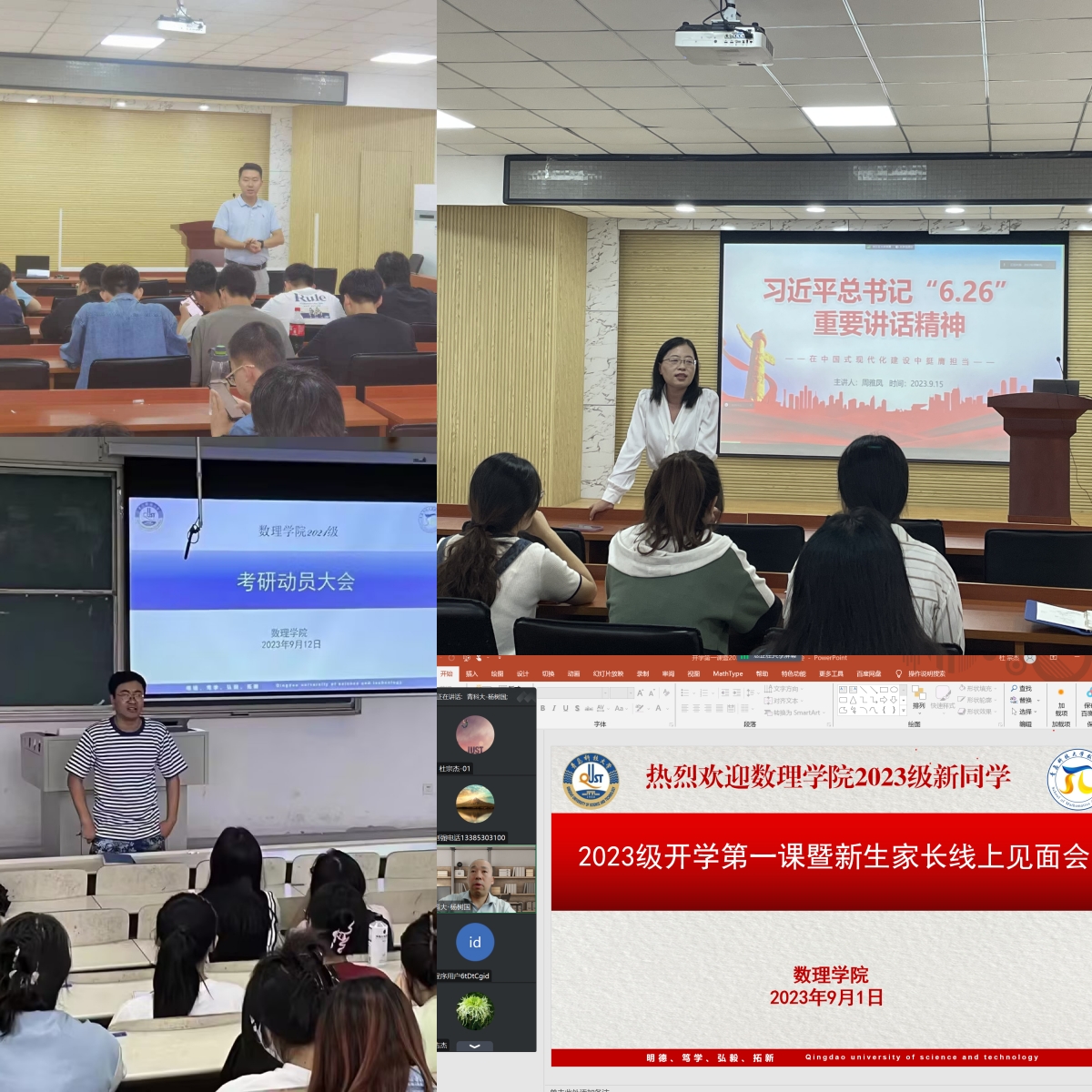 坚定理想信念,上好“立志启蒙”第一课。院长杨树国主讲“新生网络云课堂暨家长见面会”,从学院人才培养、学科建设、科学研究、对外交流合作等方面分享成绩经验,并鼓励在场学生勇于担当作为、树立远大理想、甘于埋头苦干、厚植家国情怀,引导学生树立报国之志,将理想抱负与国家命运、学校使命联系起来,并与新生针对大学生活常见的学习生活问题进行了线上交流。组织23级新生集中参加红色观影活动,《长津湖》让新生回顾了抗美援朝战争的历史背景、战斗过程和胜利意义,目睹英勇的中国军人和志愿军战士不畏强敌,勇往直前。副院长王明辉、党委副书记李雯雯围绕学术诚信、实践历练、科研能力、职业规划、等方面与23级研究生新生进行分享交流,鼓励学生新生适应新环境,转变新角色,开启新征程,以个人成长和学业成才助推科技强国建设。各年级还就加强安全责任教育、爱校荣校教育、道德规范教育、心理健康教育等问题进行了交流部署。