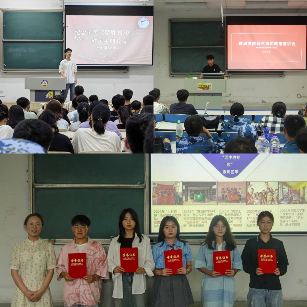 强化实践育人,上好“躬身砺行”第一课。面向大一、大二全体学生召开暑期社会实践总结表彰会,共同回顾暑期社会实践的精彩瞬间。在实践过程中,数理学子深入基层,走进甘肃、新疆、云南、河北、山东等地,涌现出一批优秀的青年志愿者,授予崔振华、张梦、王柯元等62位同学“实践π”荣誉称号。实践团队负责人代表崔振华作为“社会实践优秀个人”做典型发言,分享了实践感悟与成就,展现了青年学生在实践中学思践悟的家国情怀,体现了数理青年学生在服务社会发展中的挺膺担当,帮助新生树立躬身实践意识、强化志愿服务精神。“隐形资助育人”朋辈团队进行了资助宣讲,介绍了育人团队在23级迎新朋辈家访中发挥的重要作用,以实际行动帮助新生熟悉资助政策,并在“受助者助人”的良性循环中获取力量、传递力量。