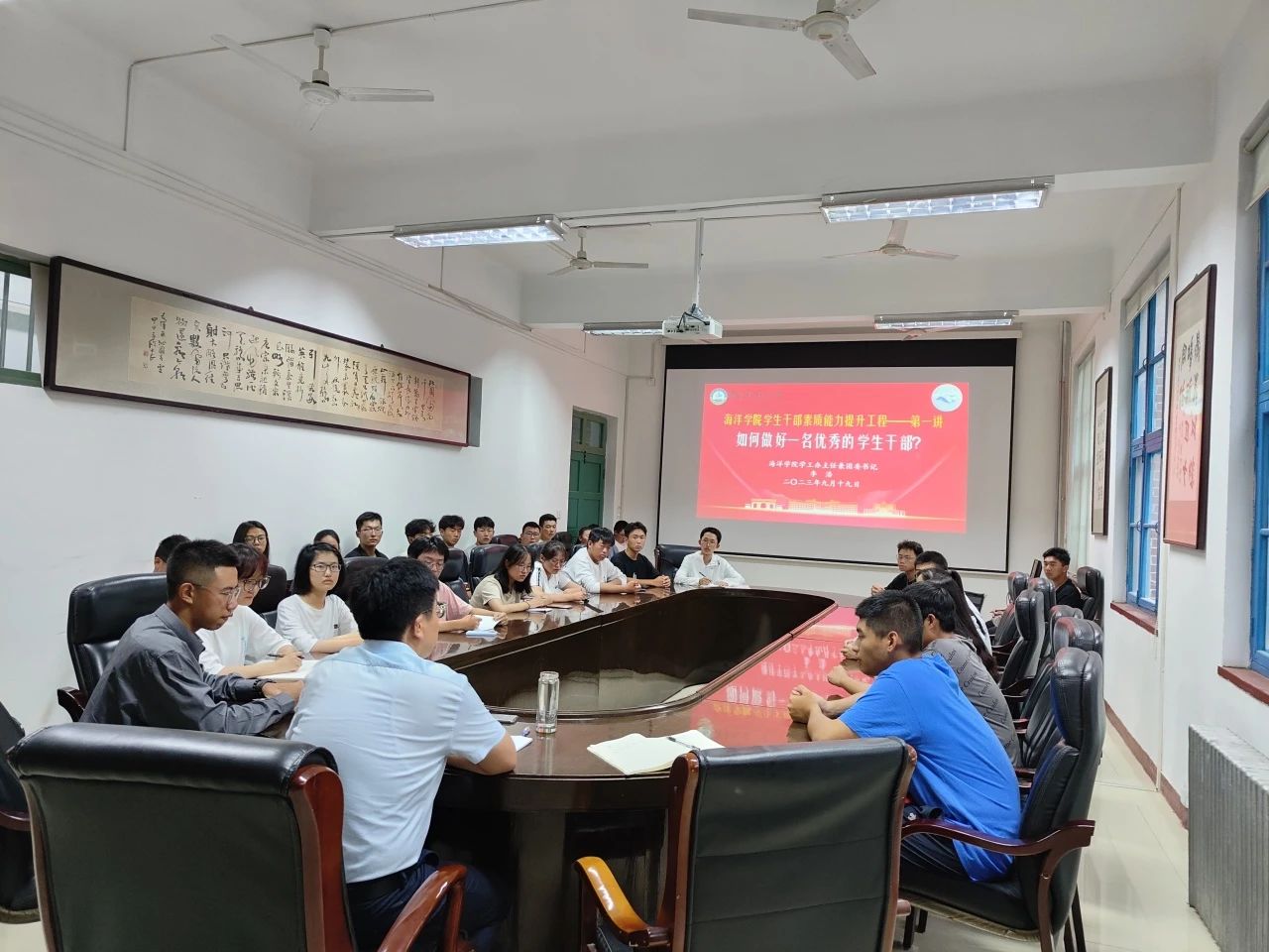 为进一步提高海洋学院2023级学生骨干的大局意识、责任意识、服务意识、奉献意识、团队意识,提高学生干部适应新环境、接受新挑战的综合能力,9月19日,海洋学院学生干部素质能力提升工程班开班,培训由海洋学院团委书记李浩主讲,新生辅导员郭颖以及各班临时负责人参加。