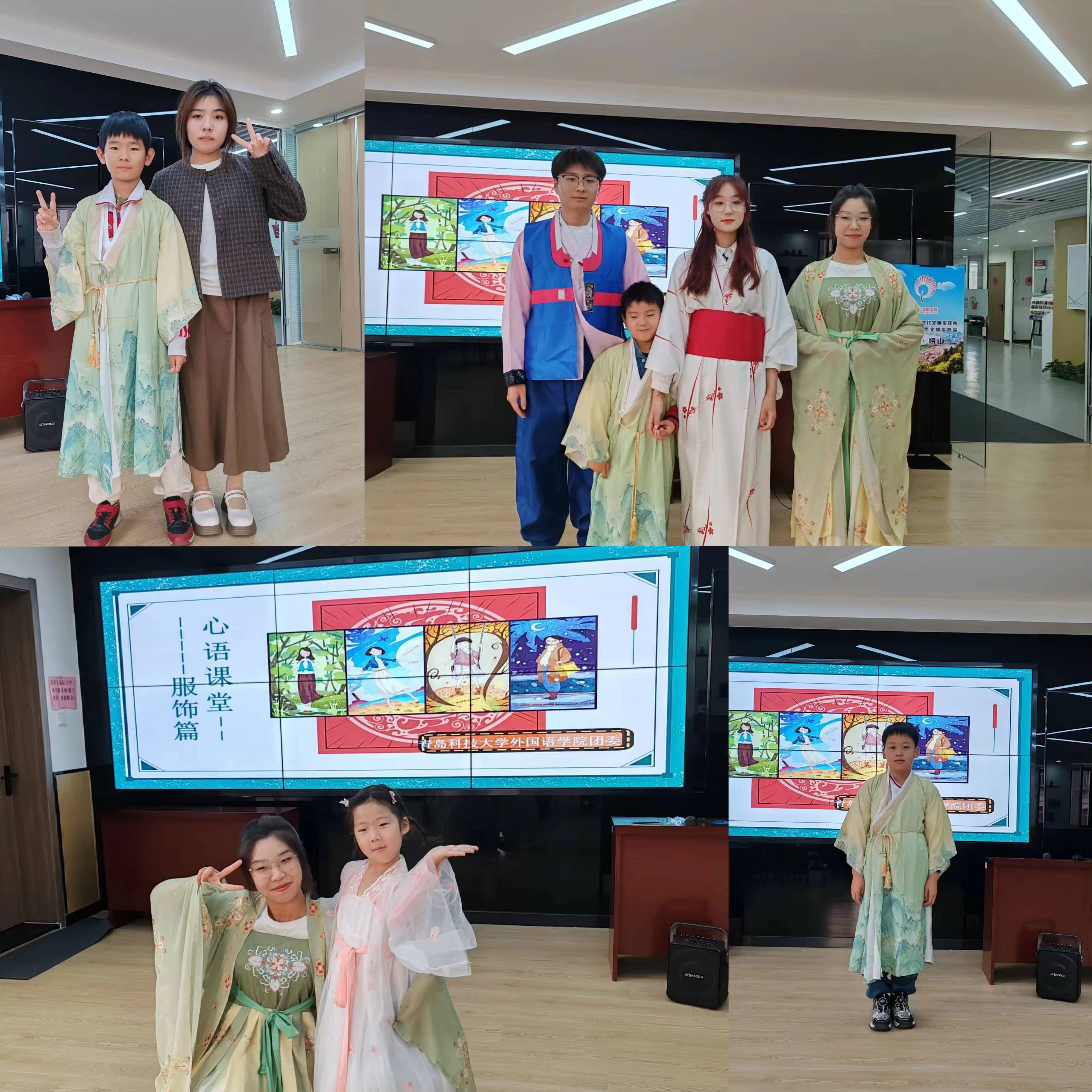 志愿者们讲解的内容以服装的重要性和差异性为核心,重点带领小朋友们了解了汉服的发展历程与特点,同时还学习了汉服和服与韩服的区别。在学习的过程中,小朋友们认真听讲,踊跃回答志愿者们提出的问题,课堂氛围十分活跃。志愿者们还带领小朋友学习了在日常生活中用英语,日语,韩语夸赞其他人的说法,小朋友们能做到迅速地掌握和应用。