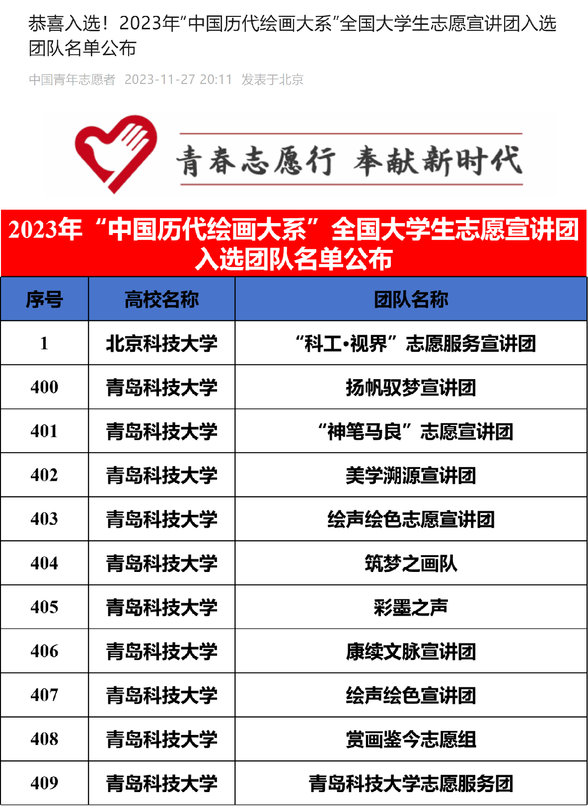 化工学院刘乙鸣同学负责的“神笔马良”志愿宣讲团、崔浩然同学负责的美学溯源宣讲团、郝迪同学负责的扬帆驭梦宣讲团、杨淑婷同学负责的康续文脉宣讲团、杨予曦同学负责的赏画鉴今志愿组、唐宽硕同学负责的绘声绘色志愿宣讲团、王欣茹同学负责的筑梦之画队、刘晓会同学负责的彩墨之声、姜素珍同学负责的绘声绘色宣讲团、黄文斌同学负责的MILE米乐集团志愿服务团成功入选。