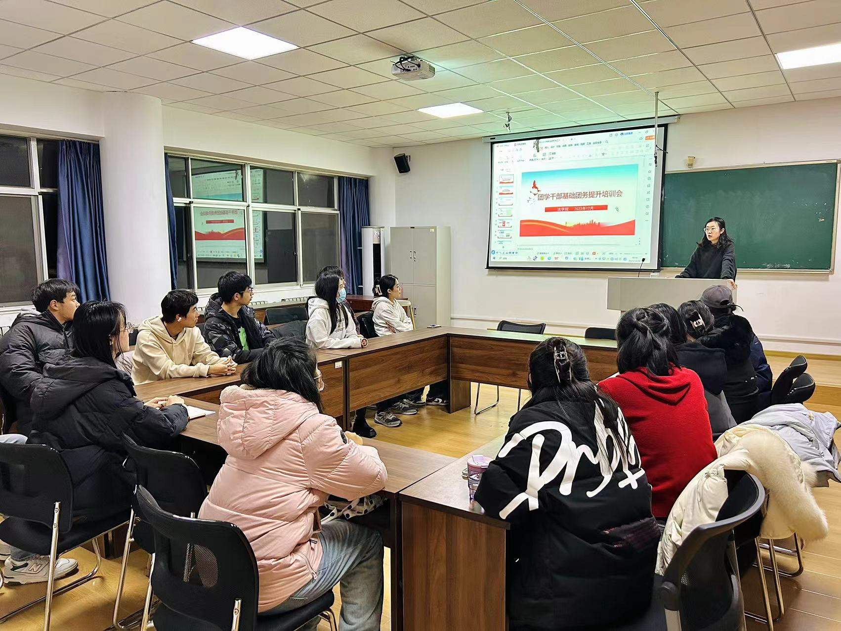 为深入学习贯彻习近平新时代中国特色社会主义思想,加强学院基层团支部和团学干部队伍建设,12月14日,法学院在弘毅楼C区党团活动室召开团学干部基础团务提升培训会,法学院团委老师王梦珂主讲,青马工程学员、新生团支部书记等参加本次培训。