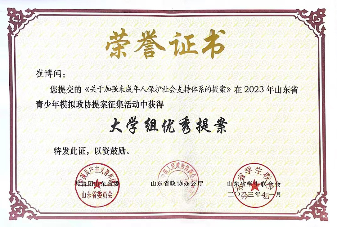 近日,由共青团山东省委、山东省政协办公厅、山东省学联联合举办的2023年山东省青少年模拟政协提案征集活动落下帷幕。法学院法学223班学生崔博闻的个人提案《关于加强未成年人保护社会支持体系的提案》获评大学组“优秀模拟提案”(全校唯一)。