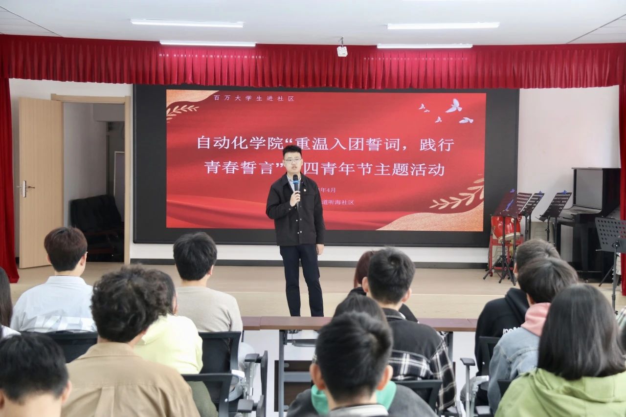 为了传承和弘扬五四精神,坚定团员青年的理想信念,激发青年团员为社区服务和国家发展贡献力量的热情,4月25日,“自”家学子走进听海社区,开展“重温入团誓词,践行青春誓言”五四青年节主题活动,听海社区党支部书记李克乐、党支部副书记蒙佳,自动化学院团委老师马仁轩、刘志飞,社区工作人员以及学院2023年秋季新发展团员参加活动。