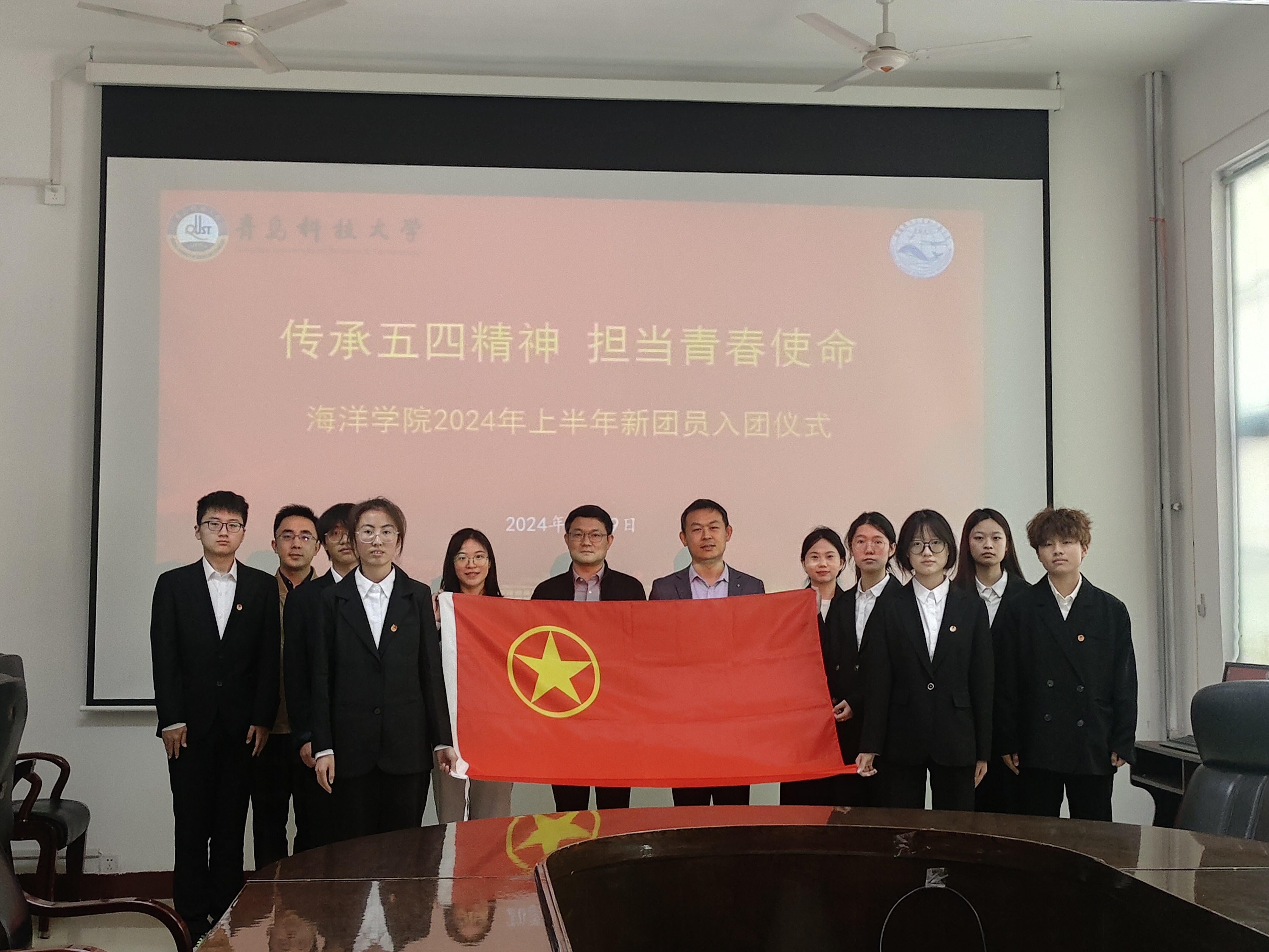 在纪念五四运动105周年之际,为深入贯彻落实党的二十大精神,充分发挥团组织的引领作用,进一步增强团组织凝聚力,规范发展团员工作,夯实党的后备军力量,4月29日,海洋学院举办“传承五四精神 担当青春使命”2024年上半年新团员入团仪式。海洋学院党委副书记兼副院长刘浩、团委书记兼学工办主任秦洪庆、学院团干部吕珊珊、车玉章、郭颖以及2024年上半年全体新发展团员参加本次仪式。