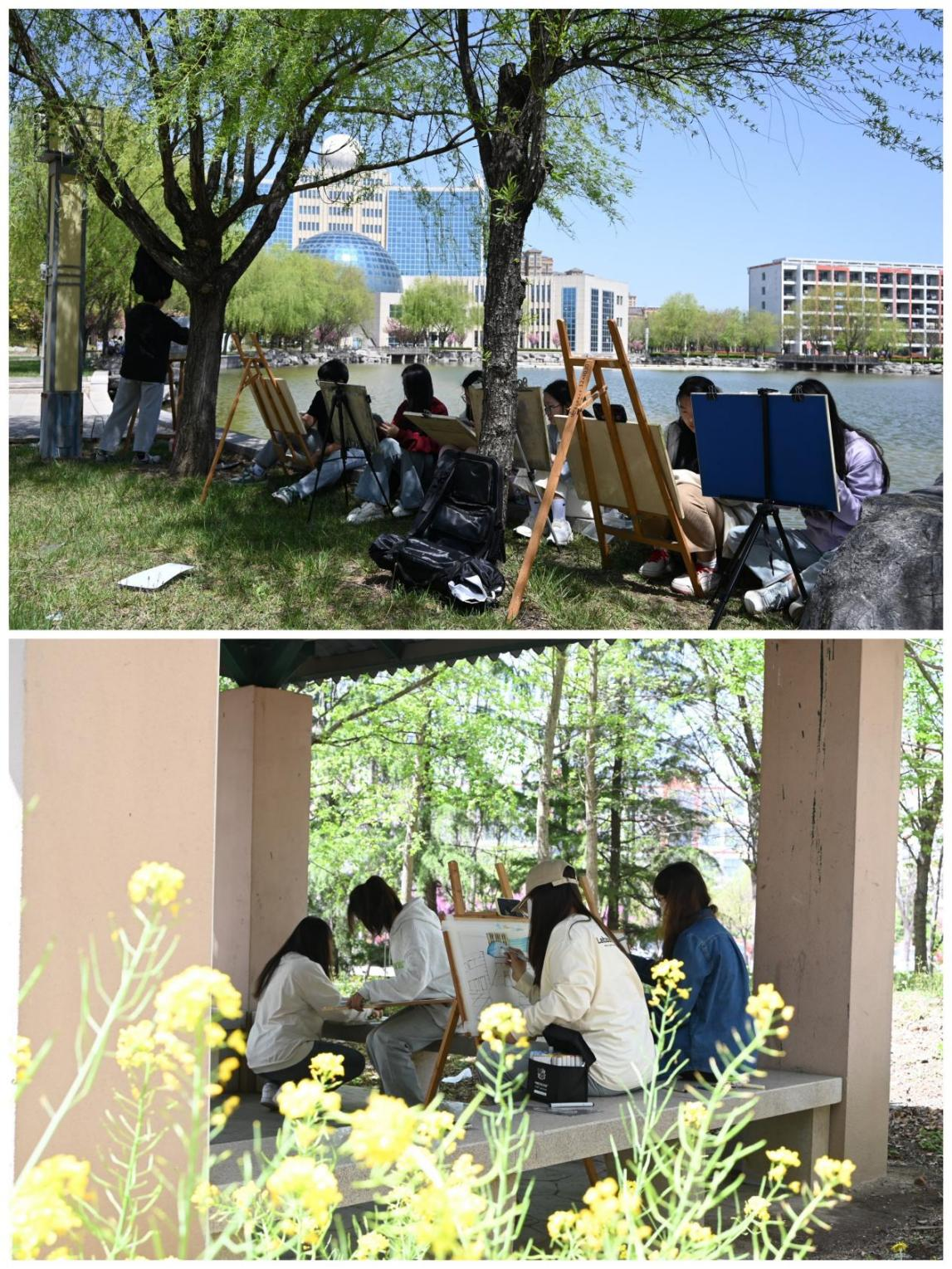 校区23级艺术专业青年学子在老师的引导下,走出教室,开始在春风如画的校园内寻找灵感。明镜湖边、图书馆前,青年学子们共同描绘青科的美丽风光。专注的创作、精湛的笔触、严谨的构图,引得过路的同学、老师纷纷驻足观赏。青年学子们以各自独特的视角,描绘了校园内的一道道风景线。