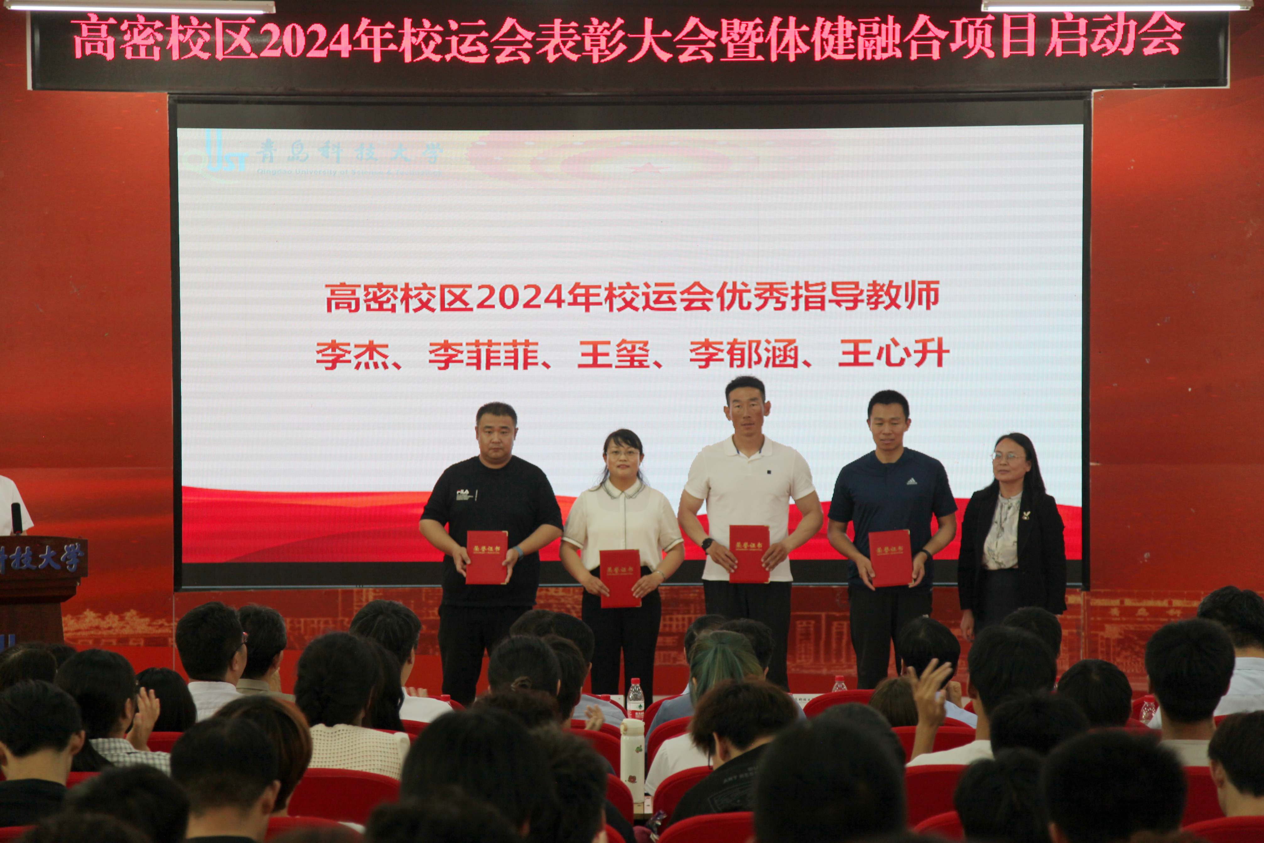 学校教务处处长马翠萍为高密校区2024年运动会优秀指导教师颁发证书,并作体健融合项目动员讲话;校区党委书记马骥为校区拔河队代表颁发奖杯和证书;学校体育综合改革办公室常务副主任楚晓东为校区2024年优秀运动员代表和优秀体育活动志愿者代表颁发证书,并宣读了《关于在高密校区开展FOOTBIKE滑行运动项目的通知》;校区党委副书记兼学生管理办公室主任王作辉宣读了《关于表彰高密校区2024年优秀运动员、优秀体育活动志愿者、拔河队员、优秀指导教师的决定》;优秀运动员代表陈祥凤同学作典型发言。